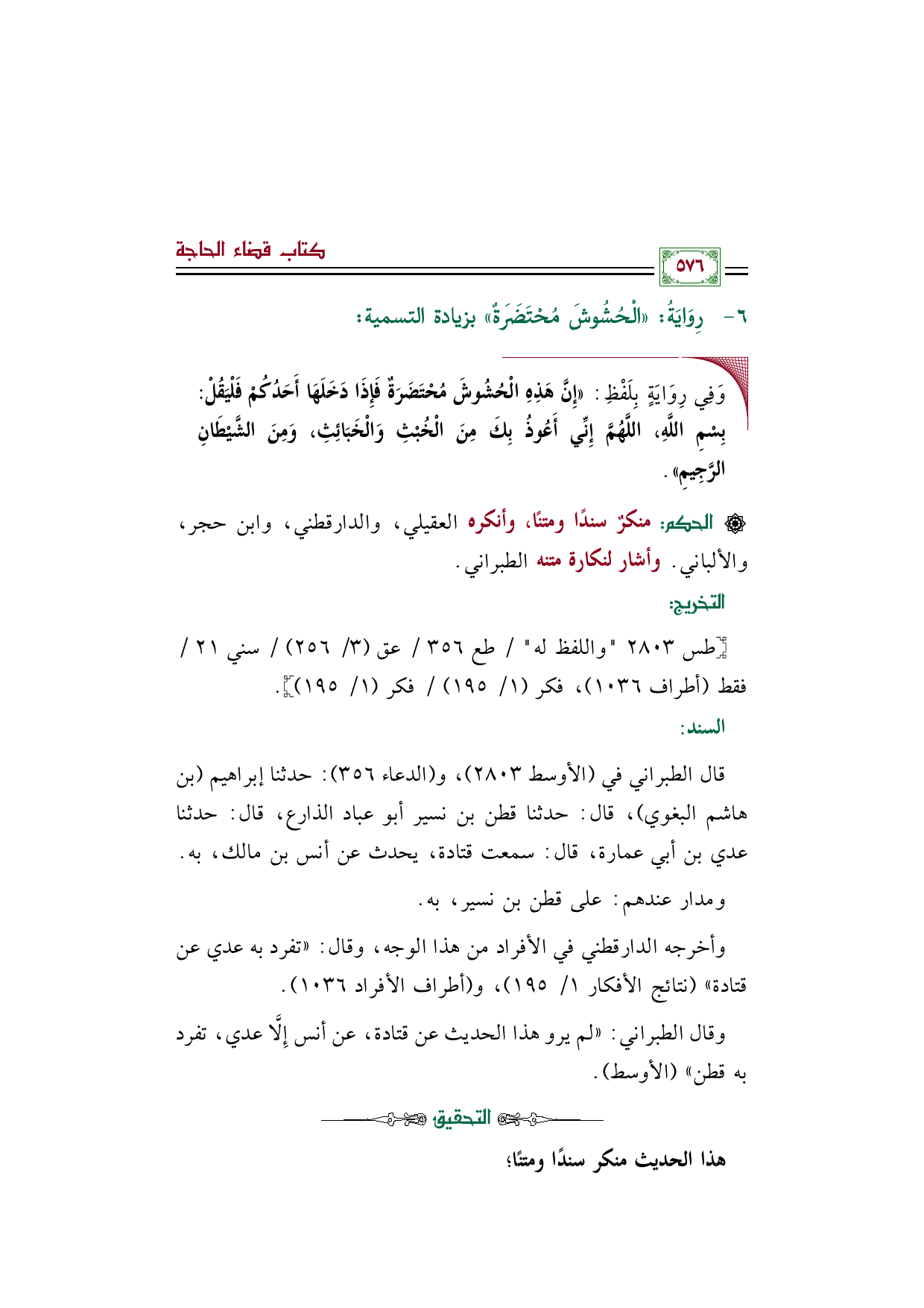 قال الطبراني في (الأوسط ٢٨٠٣)، و (الدعاء ٣٥٦): حدثنا إبراهيم (بن هاشم البغوي)، قال: حدثنا قطن بن نسير أبو عباد الذارع، قال: حدثنا عدي بن أبي عمارة، قال: سمعت قتادة، يحدث عن أنس بن مالك، به.