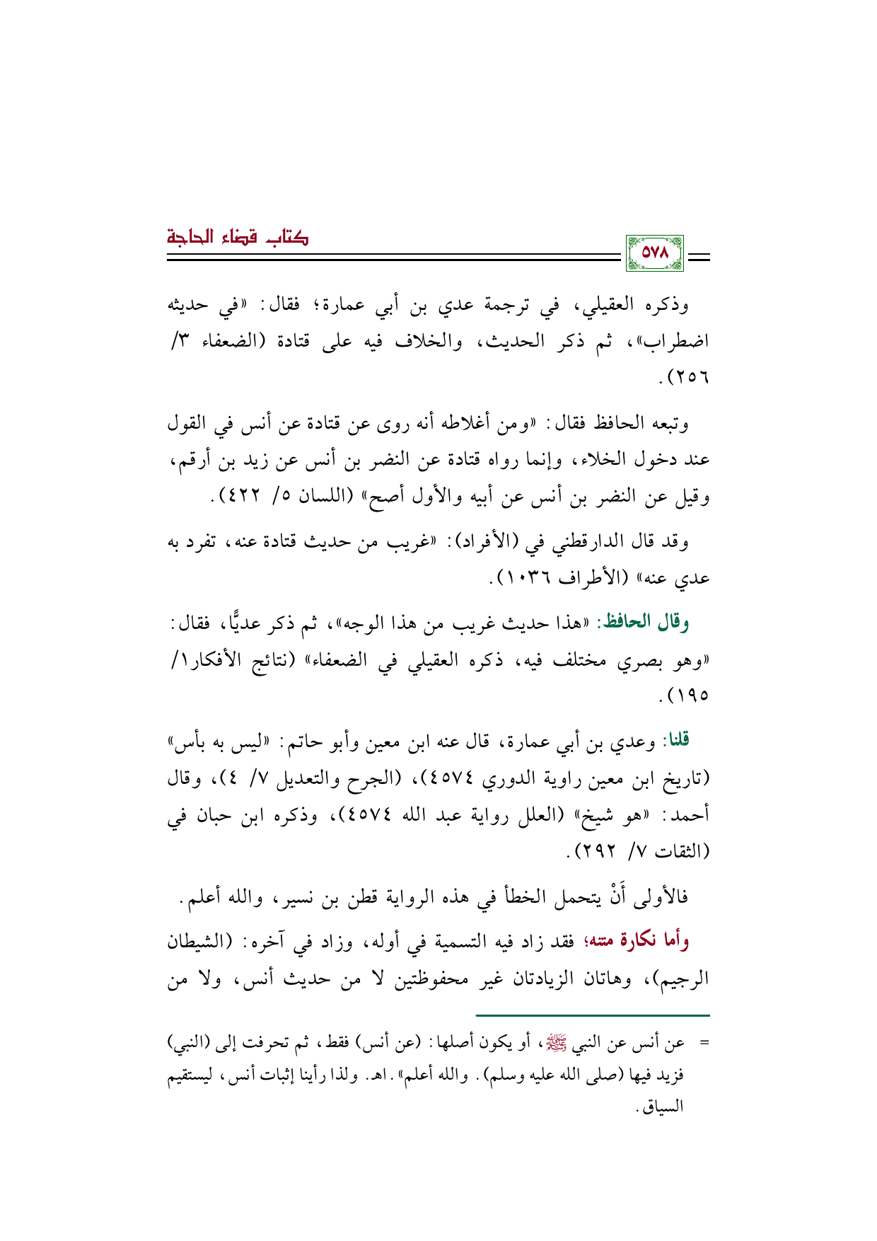 وقال الحافظ: "هذا حديث غريب من هذا الوجه"، ثم ذكر عديًّا، فقال: "وهو بصري مختلف فيه، ذكره العقيلي في الضعفاء" (نتائج الأفكار ١/ ١٩٥).