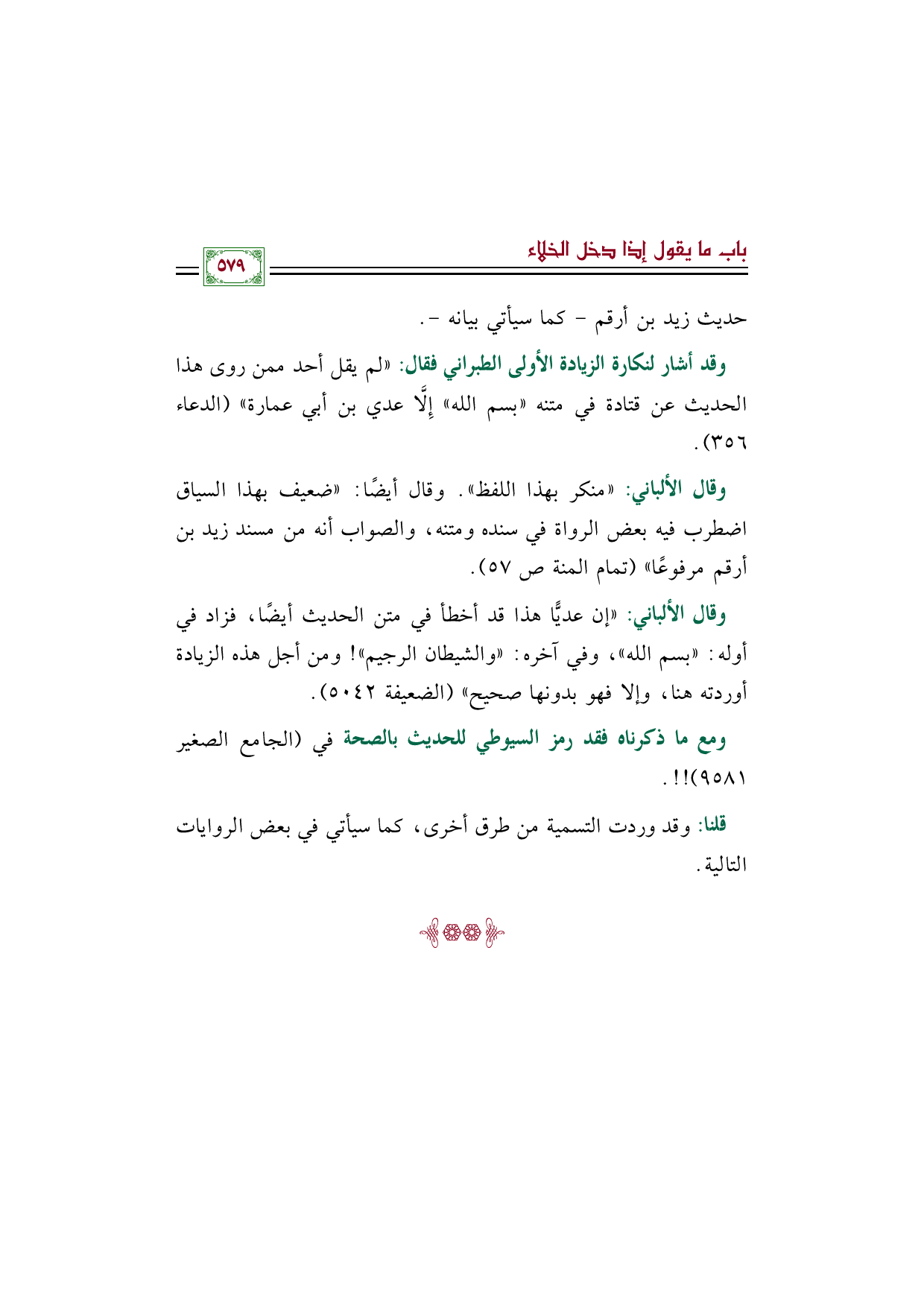 وقال الألباني: "إن عديًّا هذا قد أخطأ في متن الحديث أيضًا، فزاد في أوله: "بسم الله"، وفي آخره: "والشيطان الرجيم"! ومن أجل هذه الزيادة أوردته هنا، وإلا فهو بدونها صحيح" (الضعيفة ٥٠٤٢).