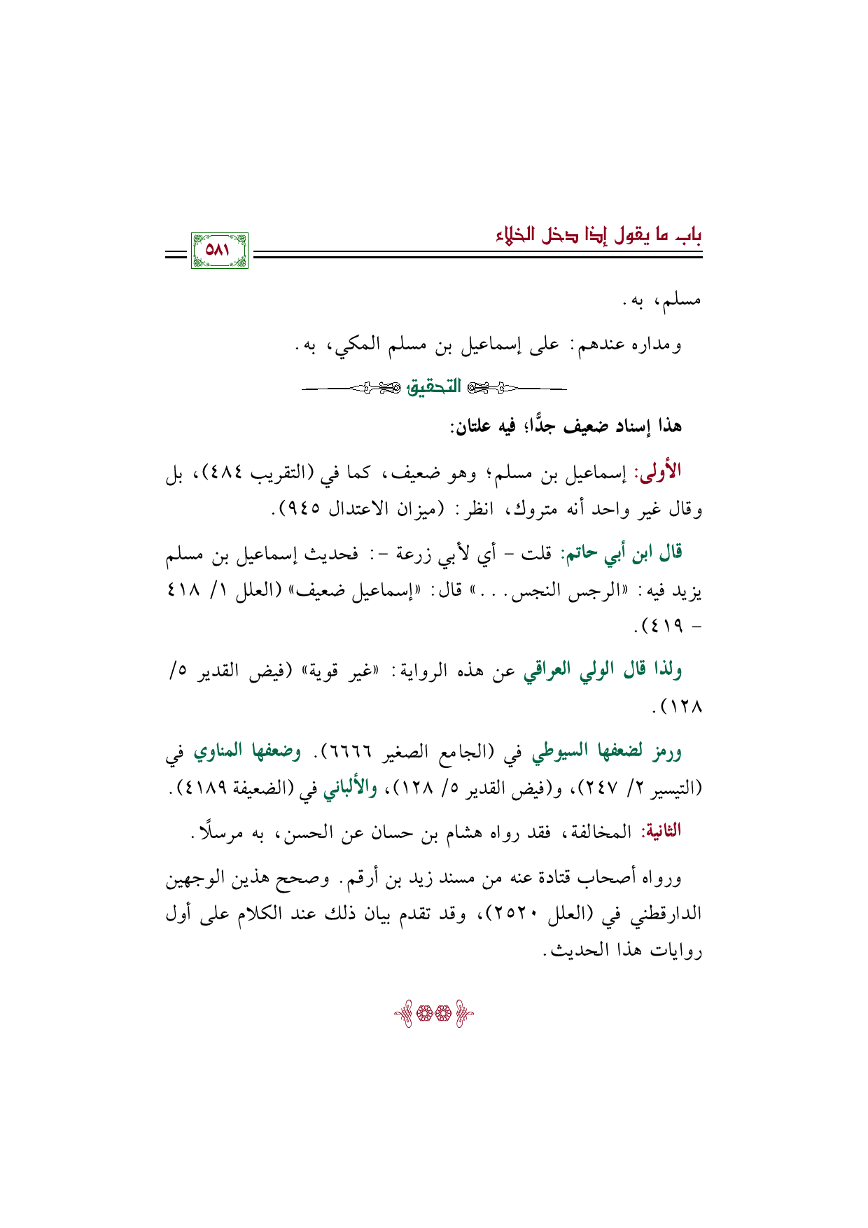 قال ابن أبي حاتم: قلت - أي لأبي زرعة -: فحديث إسماعيل بن مسلم يزيد فيه: «الرجس النجس ... » قال: "إسماعيل ضعيف" (العلل ١/ ٤١٨ - ٤١٩).