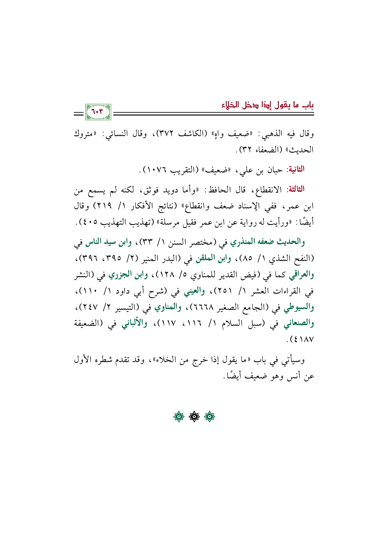 والحديث ضعفه المنذري في (مختصر السنن ١/ ٣٣)، وابن سيد الناس في (النفح الشذي ١/ ٨٥)، وابن الملقن في (البدر المنير (٢/ ٣٩٥، ٣٩٦)، والعراقي كما في (فيض القدير للمناوي ٥/ ١٢٨)، وابن الجزري في (النشر في القراءات العشر ١/ ٢٥١)، والعيني في (شرح أبي داود ١/ ١١٠)، والسيوطي في (الجامع الصغير ٦٦٦٨)، والمناوي في (التيسير ٢/ ٢٤٧)، والصنعاني في (سبل السلام ١/ ١١٦، ١١٧)، والألباني في (الضعيفة ٤١٨٧).