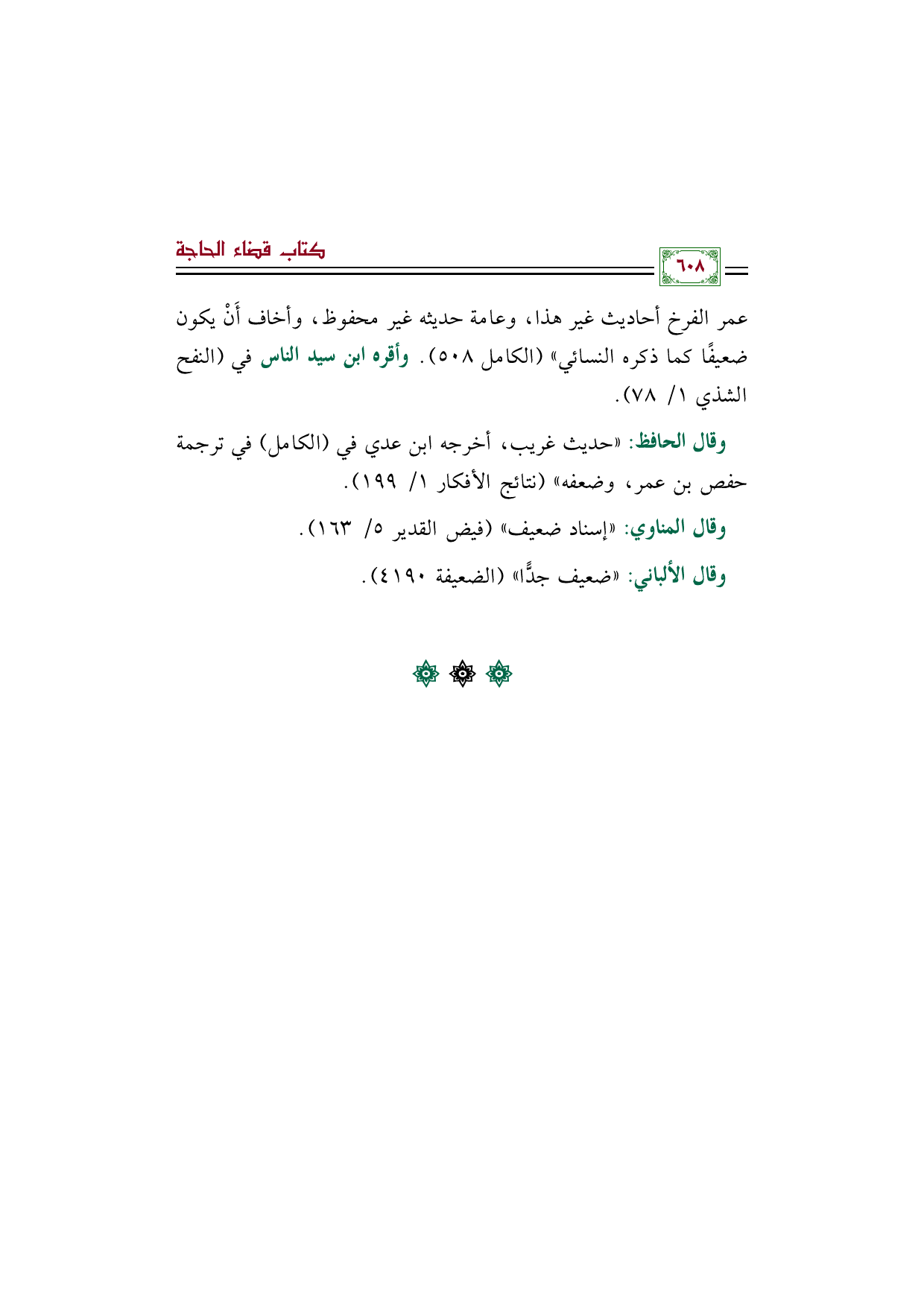 وقال الحافظ: "حديث غريب، أخرجه ابن عدي في (الكامل) في ترجمة حفص بن عمر، وضعفه" (نتائج الأفكار ١/ ١٩٩).