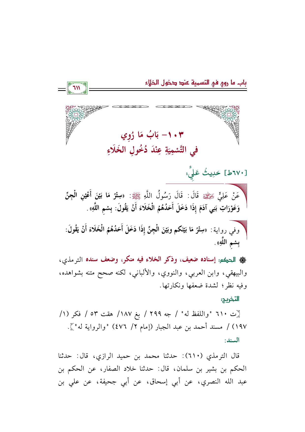 ◼ عَنْ عَلِيٍّ رضي الله عنه قَالَ: قَالَ رَسُولُ اللَّهِ صلى الله عليه وسلم: «سِتْرُ مَا بَيْنَ أَعْيُنِ الْجِنِّ وَعَوْرَاتِ بَنِي آدَمَ إِذَا دَخَلَ أَحَدُهُمُ الْخَلَاءَ أَنْ يَقُولَ: بِسْمِ اللَّهِ».