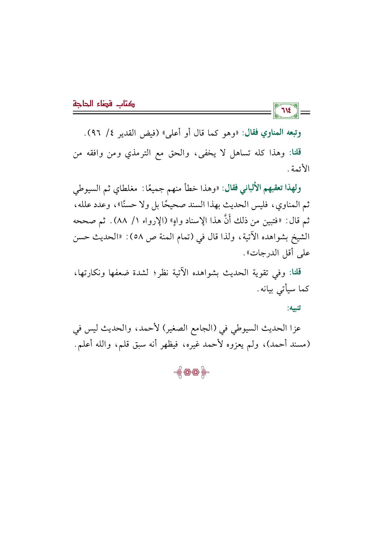 ولهذا تعقبهم الألباني فقال: "وهذا خطأ منهم جميعًا: مغلطاي ثم السيوطي ثم المناوي، فليس الحديث بهذا السند صحيحًا بل ولا حسنًا"، وعدد علله، ثم قال: "فتبين من ذلك أَنَّ هذا الإسناد واهٍ" (الإرواء ١/ ٨٨). ثم صححه الشيخ بشواهده الآتية، ولذا قال في (تمام المنة ص ٥٨): "الحديث حسن على أقل الدرجات".
