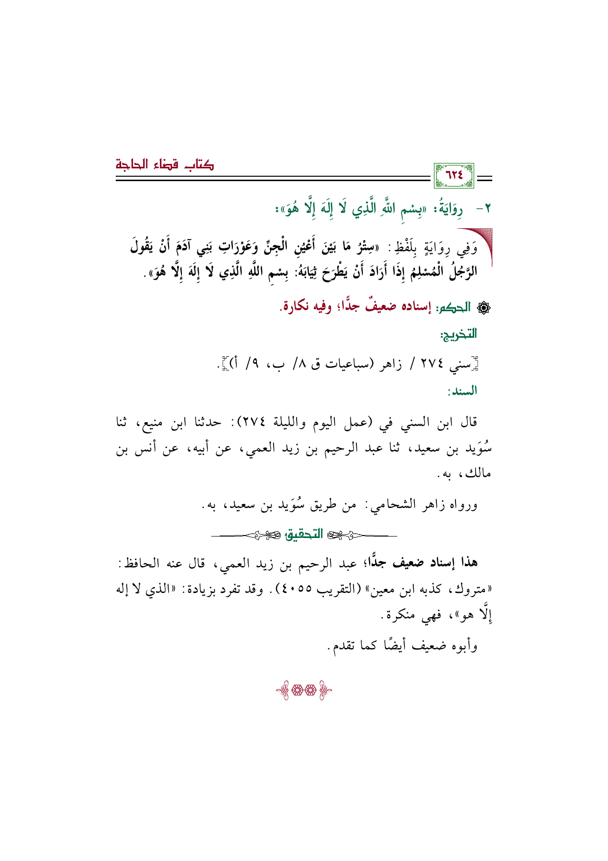 قال ابن السني في (عمل اليوم والليلة ٢٧٤): حدثنا ابن منيع، ثنا سُوَيد بن سعيد، ثنا عبد الرحيم بن زيد العمي، عن أبيه، عن أنس بن مالك، به.