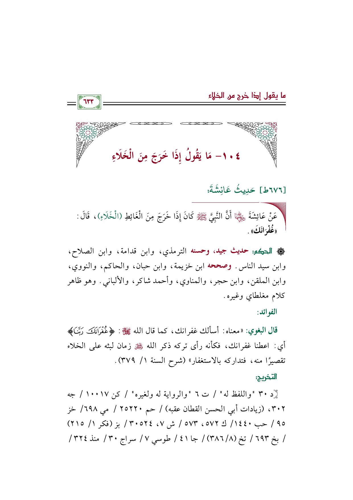 ◼ عَنْ عَائِشَةَ رضي الله عنها أَنَّ النَّبِيَّ صلى الله عليه وسلم كَانَ إِذَا خَرَجَ مِنَ الْغَائِطِ (الْخَلَاءِ)، قَالَ: «غُفْرَانَكَ».