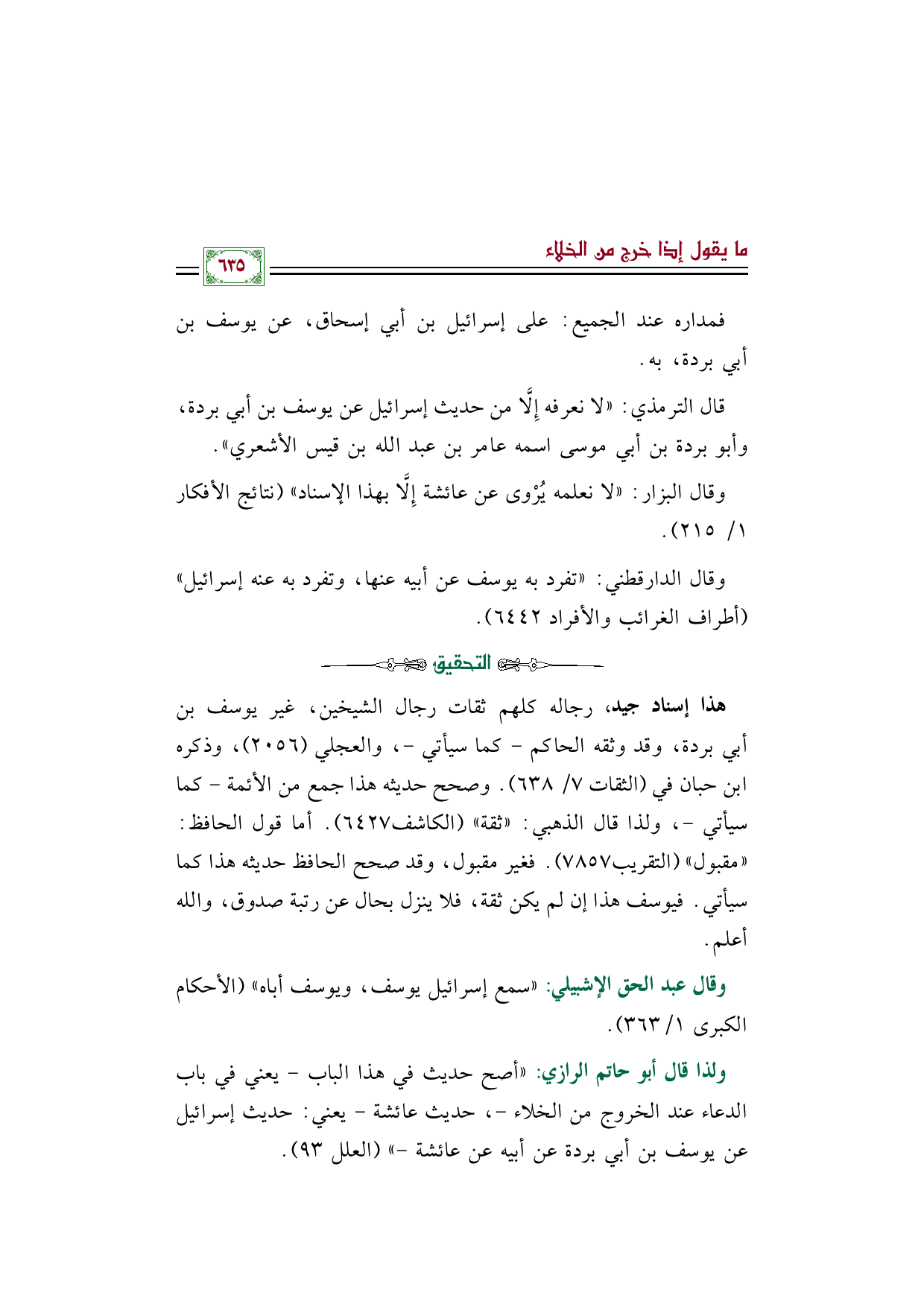 ولذا قال أبو حاتم الرازي: "أصح حديث في هذا الباب - يعني في باب الدعاء عند الخروج من الخلاء -، حديث عائشة - يعني: حديث إسرائيل عن يوسف بن أبي بردة عن أبيه عن عائشة -" (العلل ٩٣).