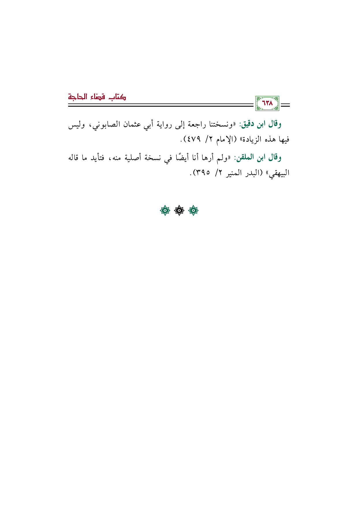 وقال ابن دقيق: "ونسختنا راجعة إلى رواية أبي عثمان الصابوني، وليس فيها هذه الزيادة" (الإمام ٢/ ٤٧٩).