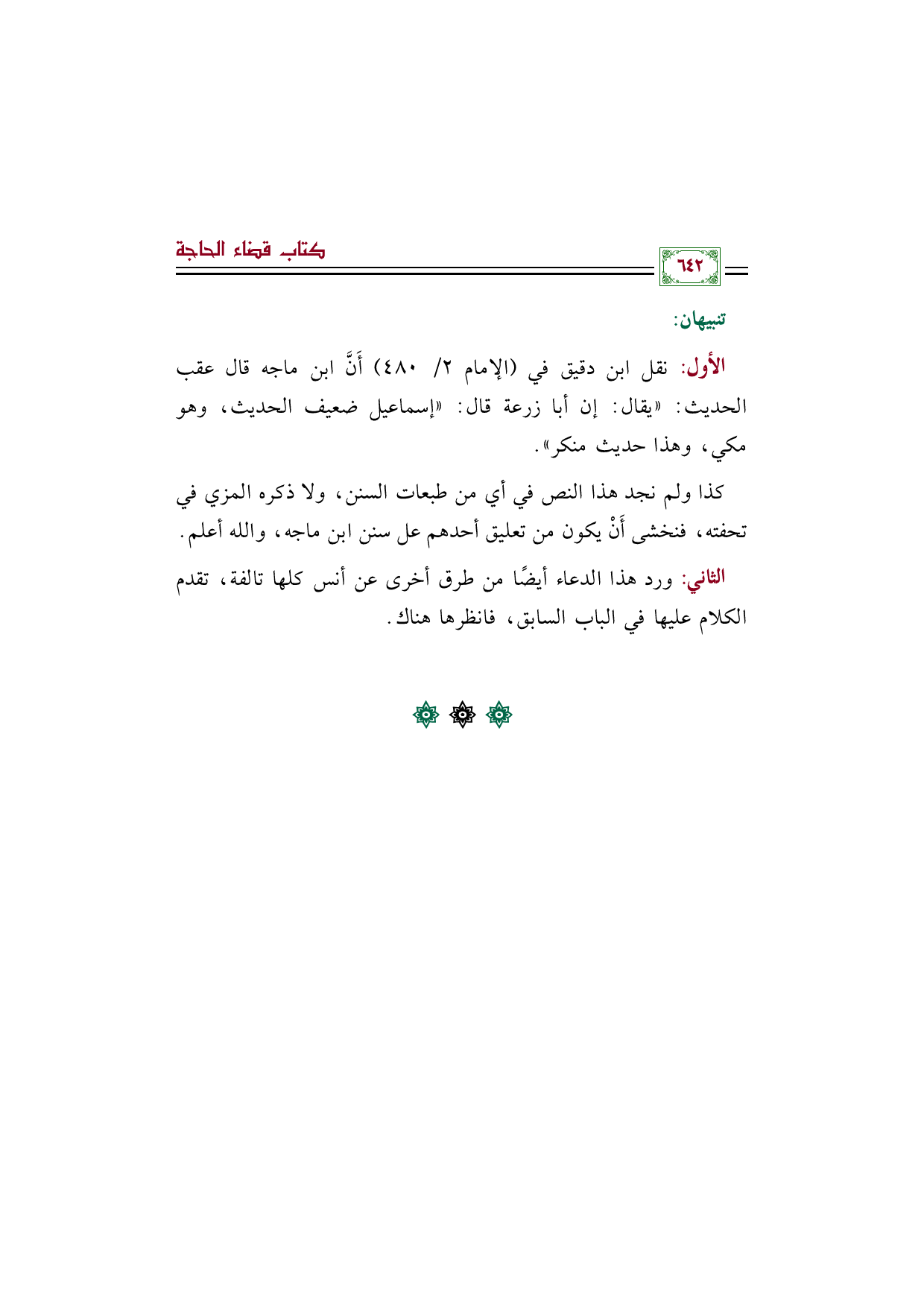 نقل ابن دقيق في (الإمام ٢/ ٤٨٠) أَنَّ ابن ماجه قال عقب الحديث: "يقال: إن أبا زرعة قال: "إسماعيل ضعيف الحديث، وهو مكي، وهذا حديث منكر".