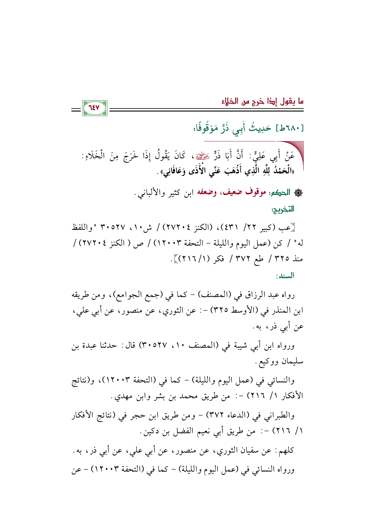 رواه عبد الرزاق في (المصنف) - كما في (جمع الجوامع)، ومن طريقه ابن المنذر في (الأوسط ٣٢٥) -: عن الثوري، عن منصور، عن أبي علي، عن أبي ذر، به.