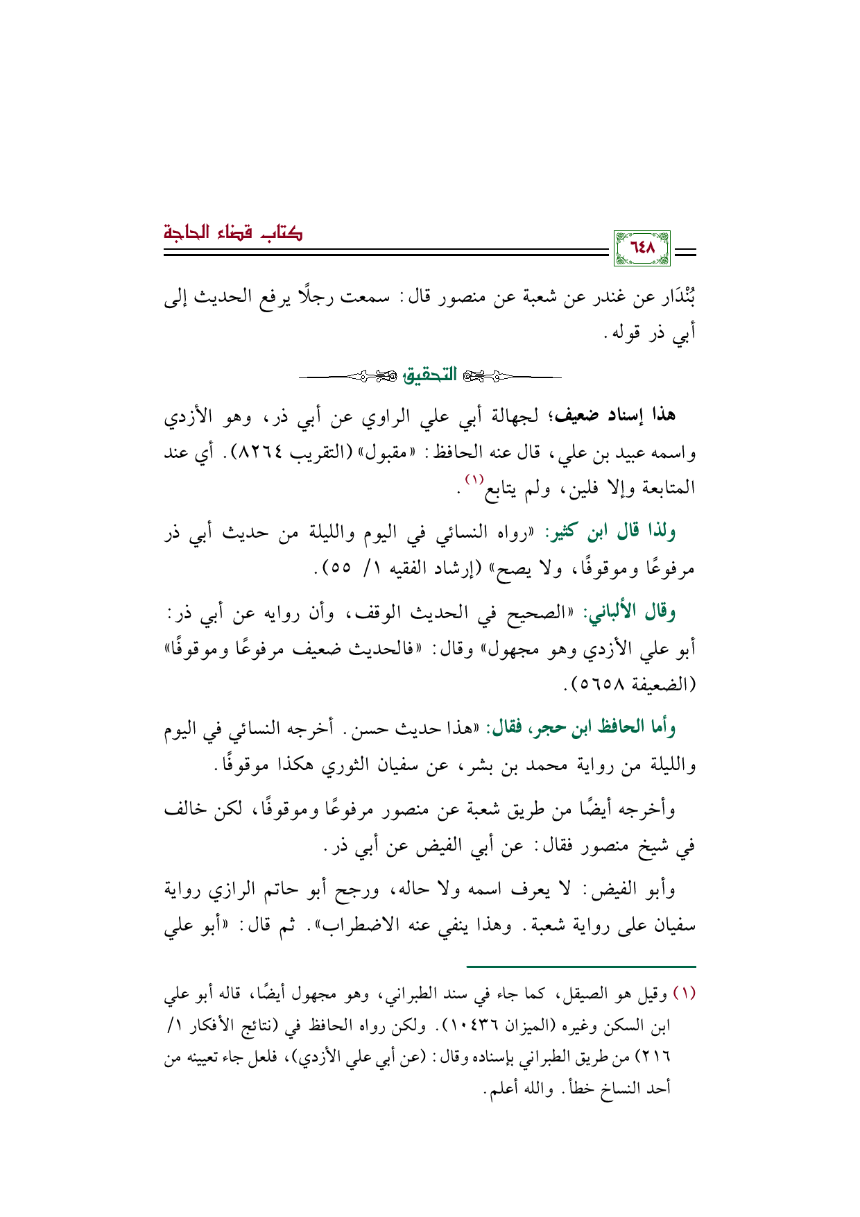 هذا إسناد ضعيف؛ لجهالة أبي علي الراوي عن أبي ذر، وهو الأزدي واسمه عبيد بن علي، قال عنه الحافظ: "مقبول" (التقريب ٨٢٦٤). أي عند المتابعة وإلا فلين، ولم يتابع (¬١).