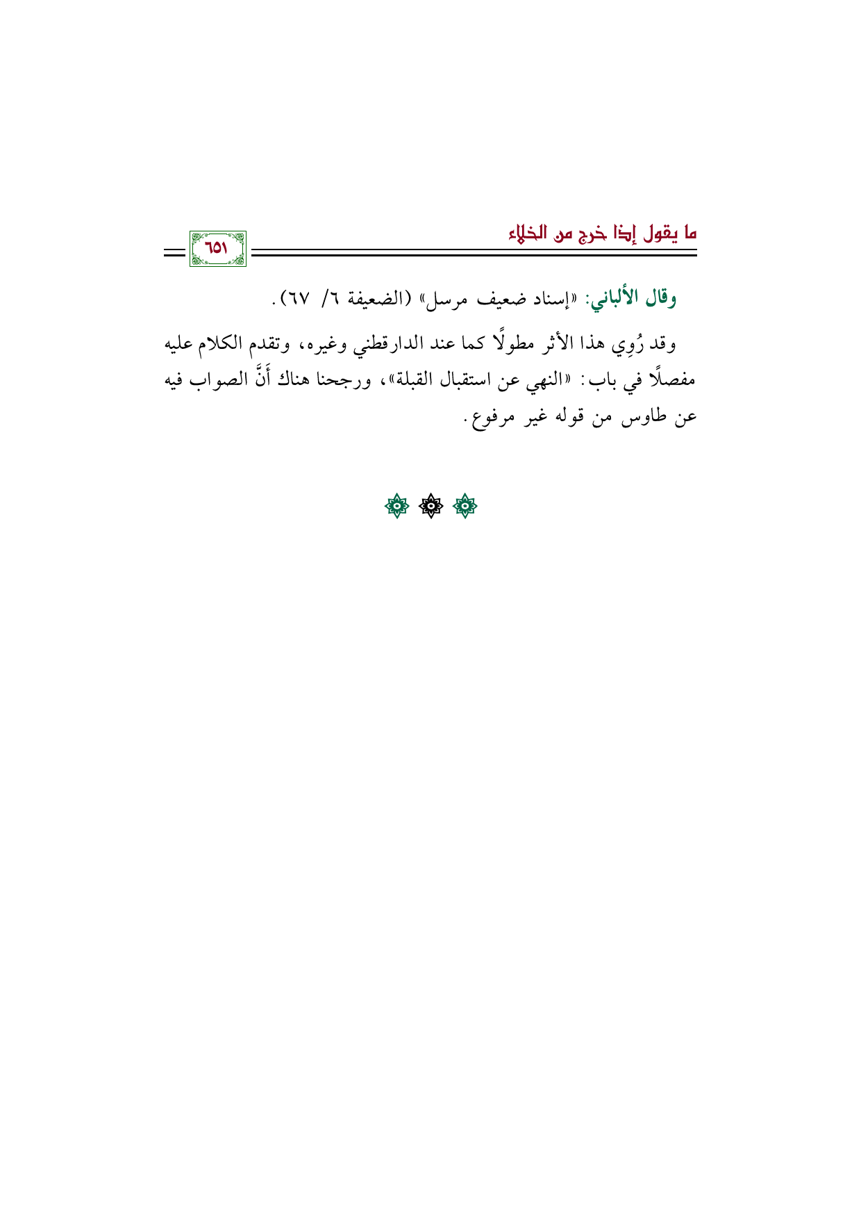 وقد رُوِي هذا الأثر مطولًا كما عند الدارقطني وغيره، وتقدم الكلام عليه مفصلًا في باب: "النهي عن استقبال القبلة"، ورجحنا هناك أَنَّ الصواب فيه عن طاوس من قوله غير مرفوع.