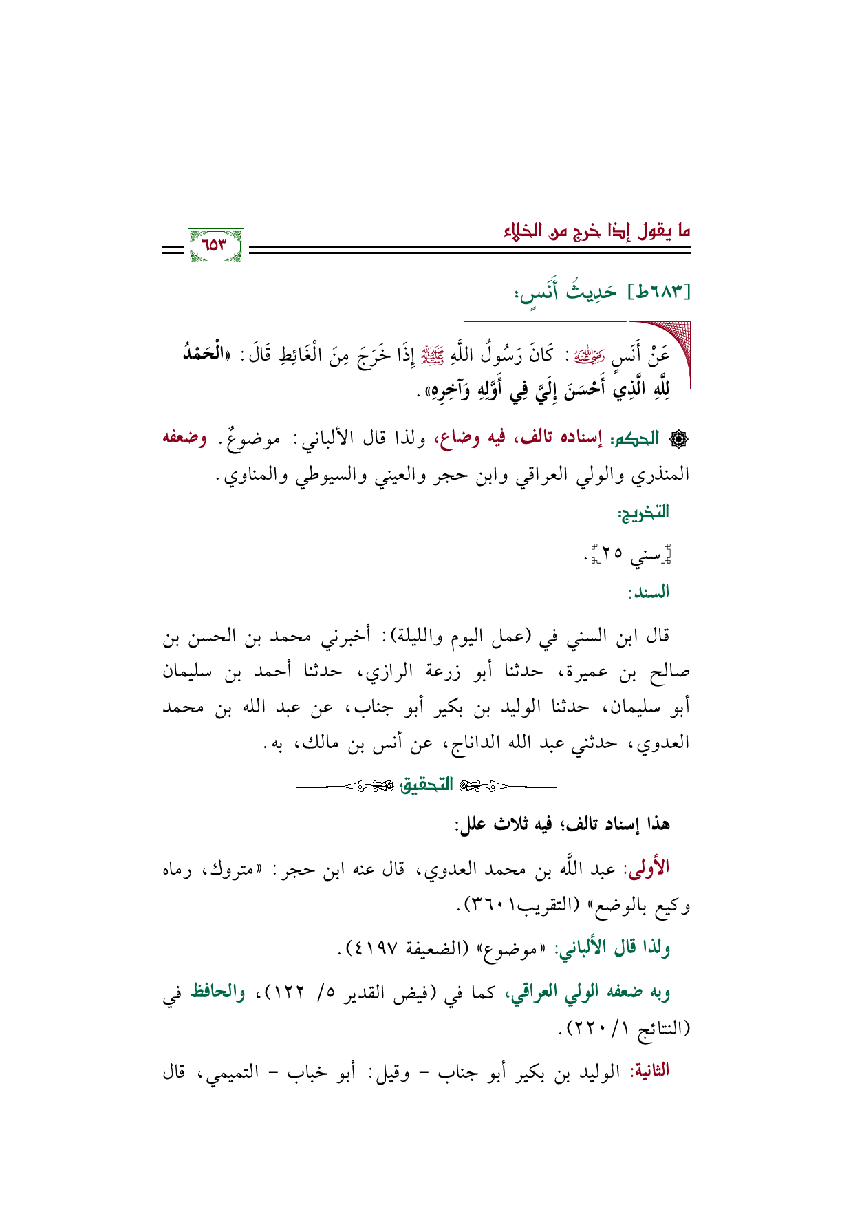 ◼ عَنْ أَنَسٍ رضي الله عنه: كَانَ رَسُولُ اللَّهِ صلى الله عليه وسلم إِذَا خَرَجَ مِنَ الْغَائِطِ قَالَ: «الْحَمْدُ لِلَّهِ الَّذِي أَحْسَنَ إِلَيَّ فِي أَوَّلِهِ وَآخِرِهِ».