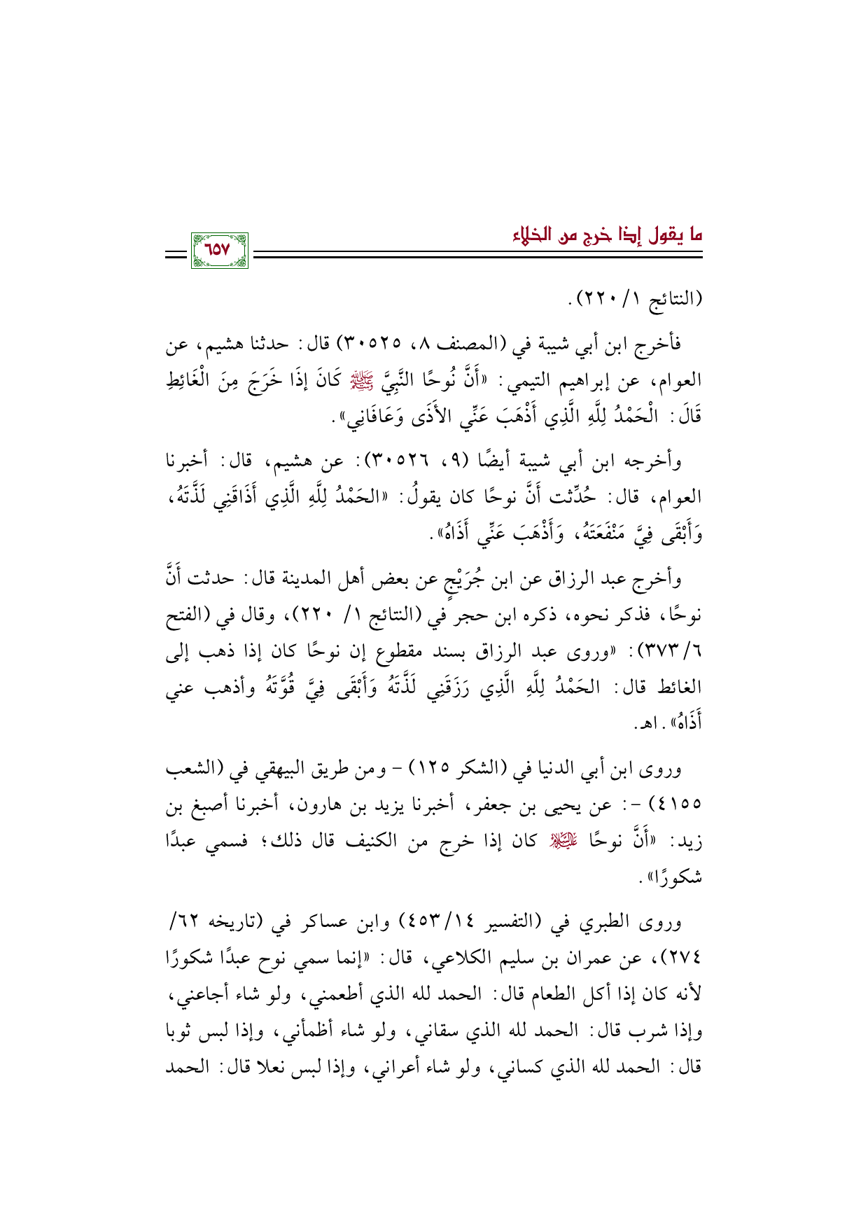 فأخرج ابن أبي شيبة في (المصنف ٨، ٣٠٥٢٥) قال: حدثنا هشيم، عن العوام، عن إبراهيم التيمي: «أَنَّ نُوحًا النَّبِيَّ صلى الله عليه وسلم كَانَ إذَا خَرَجَ مِنَ الْغَائِطِ قَالَ: الْحَمْدُ لِلَّهِ الَّذِي أَذْهَبَ عَنِّي الأَذَى وَعَافَانِي».