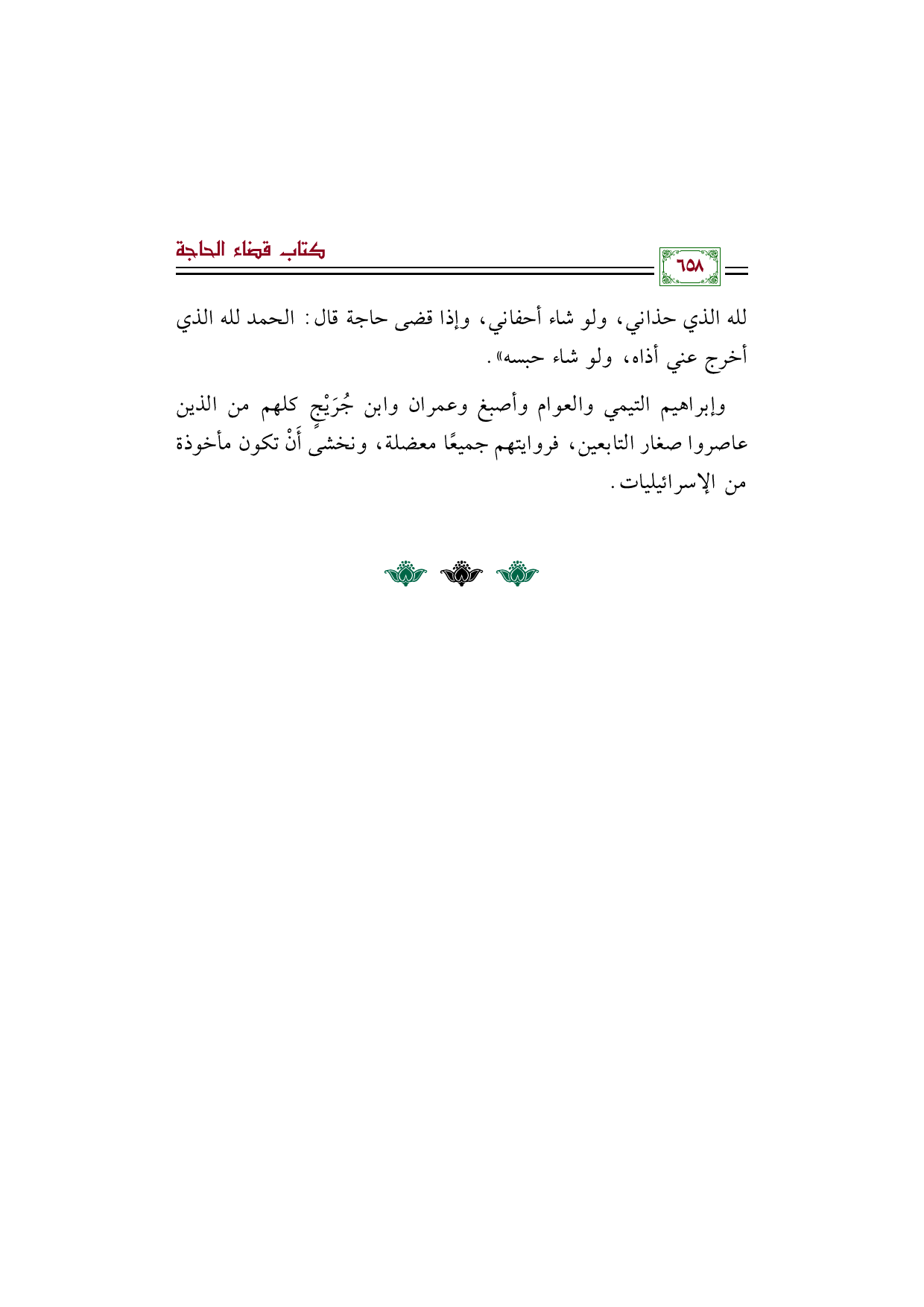 لله الذي حذاني، ولو شاء أحفاني، وإذا قضى حاجة قال: الحمد لله الذي أخرج عني أذاه، ولو شاء حبسه».
