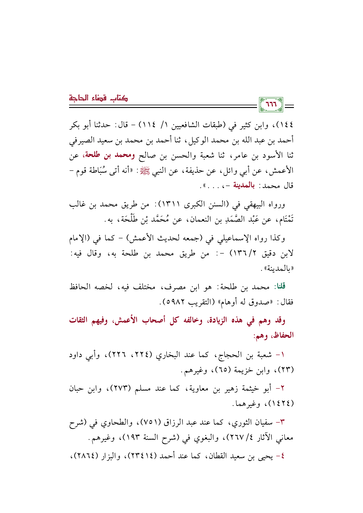 ١٤٤)، وابن كثير في (طبقات الشافعيين ١/ ١١٤) - قال: حدثنا أبو بكر أحمد بن عبد الله بن محمد الوكيل، ثنا أحمد بن محمد بن سعيد الصيرفي ثنا الأسود بن عامر، ثنا شعبة والحسن بن صالح ومحمد بن طلحة، عن الأعمش، عن أبي وائل، عن حذيفة، عن النبي صلى الله عليه وسلم: «أنه أتى سُبَاطة قوم - قال محمد: بالمدينة -، ... ».