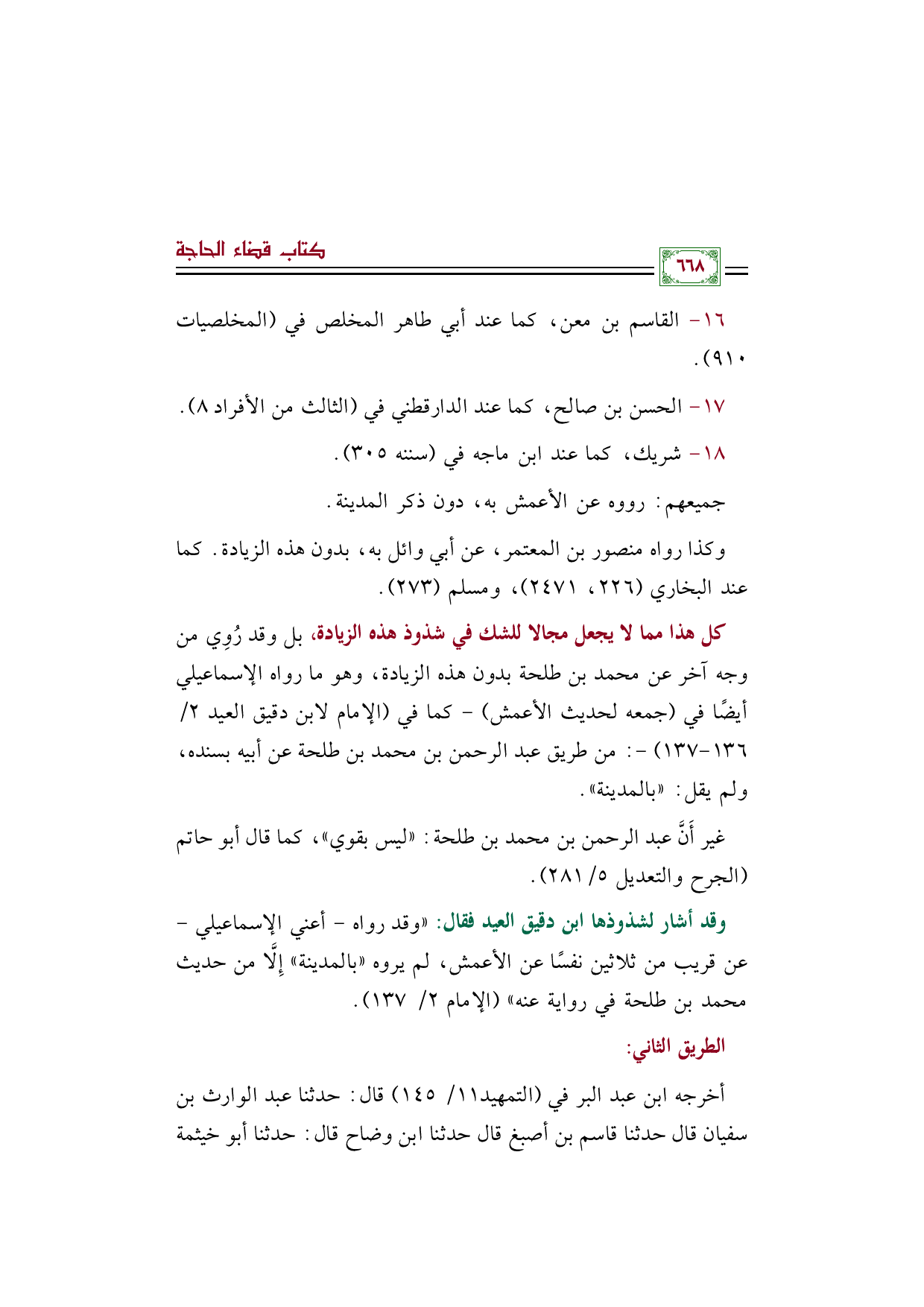 كل هذا مما لا يجعل مجالا للشك في شذوذ هذه الزيادة، بل وقد رُوِي من وجه آخر عن محمد بن طلحة بدون هذه الزيادة، وهو ما رواه الإسماعيلي أيضًا في (جمعه لحديث الأعمش) - كما في (الإمام لابن دقيق العيد ٢/ ١٣٦ - ١٣٧) -: من طريق عبد الرحمن بن محمد بن طلحة عن أبيه بسنده، ولم يقل: "بالمدينة".