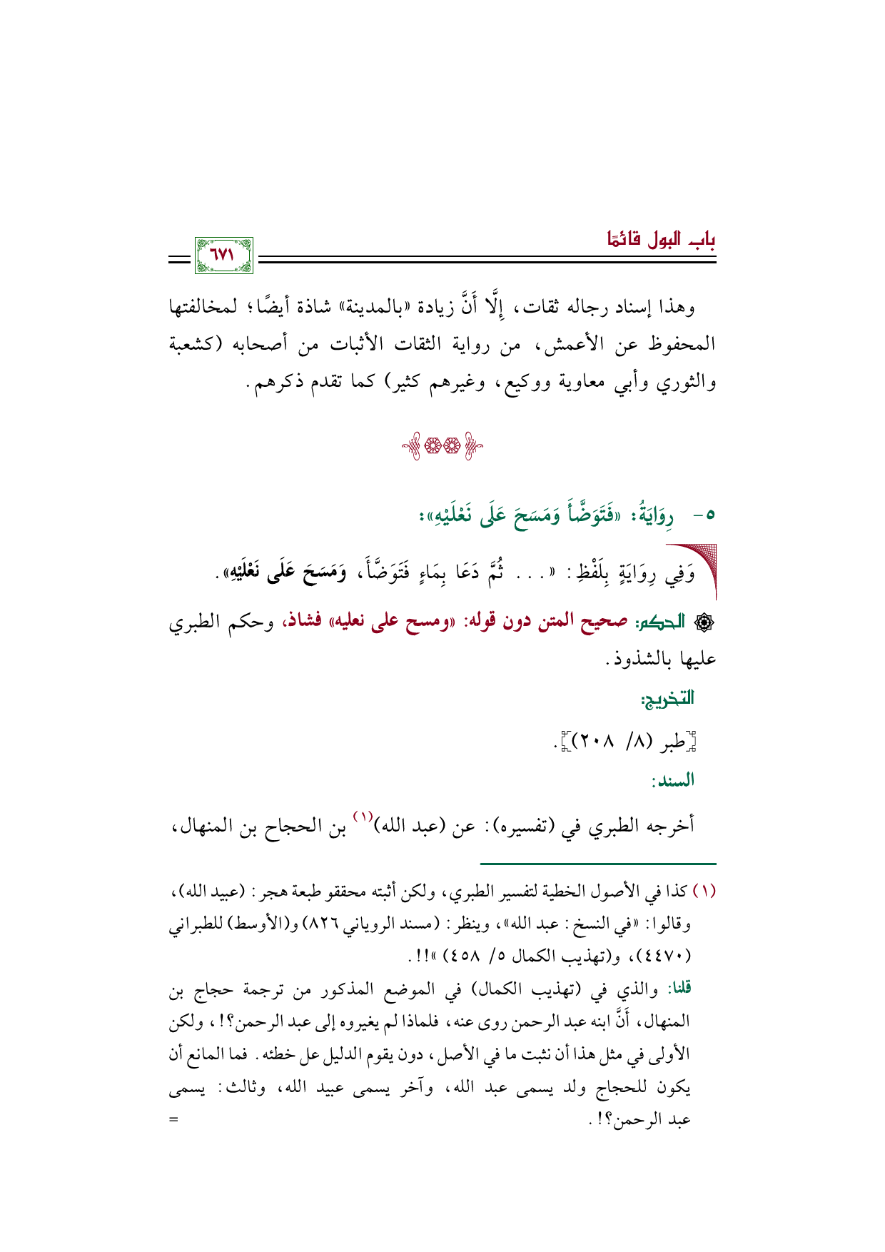 قلنا: والذي في (تهذيب الكمال) في الموضع المذكور من ترجمة حجاج بن المنهال، أَنَّ ابنه عبد الرحمن روى عنه، فلماذا لم يغيروه إلى عبد الرحمن؟!، ولكن الأولى في مثل هذا أن نثبت ما في الأصل، دون يقوم الدليل عل خطئه. فما المانع أن يكون للحجاج ولد يسمى عبد الله، وآخر يسمى عبيد الله، وثالث: يسمى عبد الرحمن؟!.