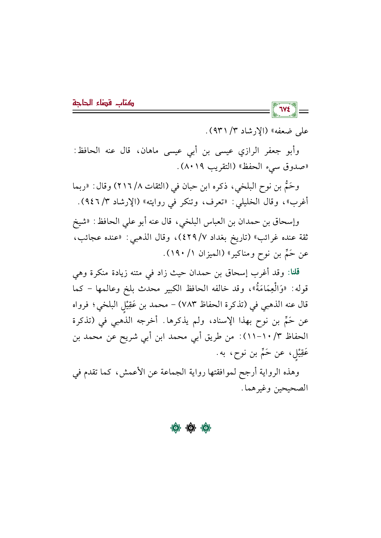 قلنا: وقد أغرب إسحاق بن حمدان حيث زاد في متنه زيادة منكرة وهي قوله: "وَالْعِمَامَةُ"، وقد خالفه الحافظ الكبير محدث بلخ وعالمها - كما قال عنه الذهبي في (تذكرة الحفاظ ٧٨٣) - محمد بن عَقِيْلٍ البلخي؛ فرواه عن حَمِّ بن نوح بهذا الإسناد، ولم يذكرها. أخرجه الذهبي في (تذكرة الحفاظ ٣/ ١٠ - ١١): من طريق أبي محمد ابن أبي شريح عن محمد بن عَقِيْلٍ، عن حَمِّ بن نوح، به.