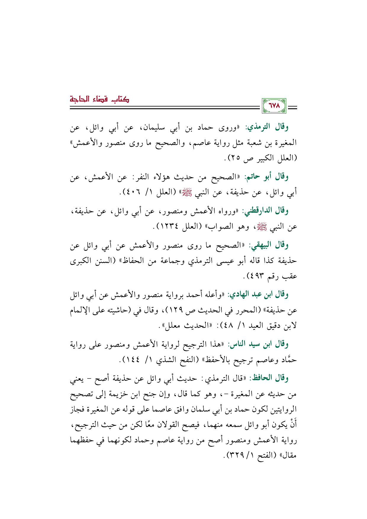 وقال ابن عبد الهادي: "وأعله أحمد برواية منصور والأعمش عن أبي وائل عن حذيفة" (المحرر في الحديث ص ١٢٩)، وقال في (حاشيته على الإلمام لابن دقيق العيد ١/ ٤٨): "الحديث معلل".