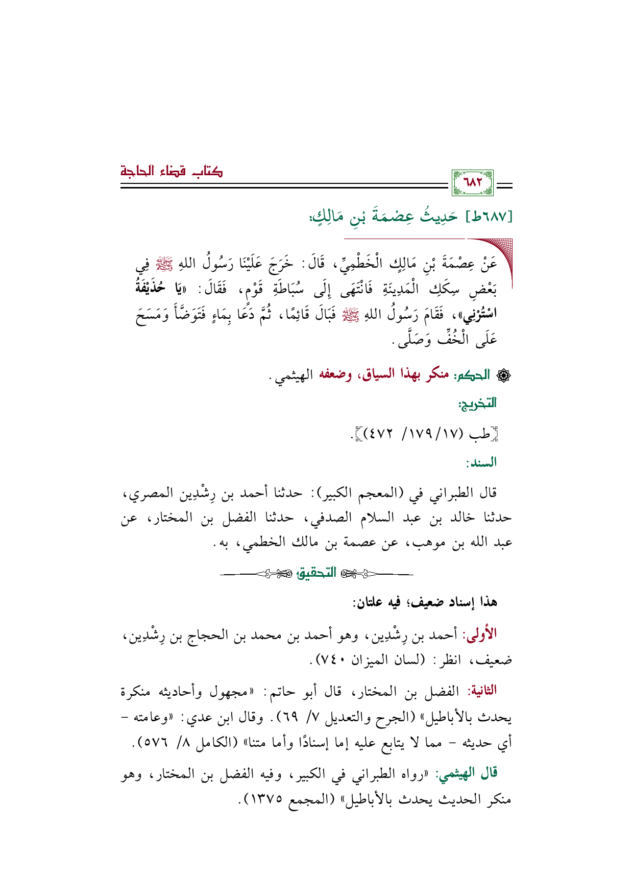 قال الطبراني في (المعجم الكبير): حدثنا أحمد بن رِشْدِين المصري، حدثنا خالد بن عبد السلام الصدفي، حدثنا الفضل بن المختار، عن عبد الله بن موهب، عن عصمة بن مالك الخطمي، به.