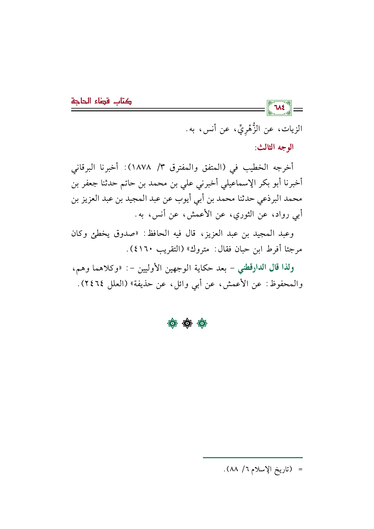 ولذا قال الدارقطني - بعد حكاية الوجهين الأوليين -: "وكلاهما وهم، والمحفوظ: عن الأعمش، عن أبي وائل، عن حذيفة" (العلل ٢٤٦٤).