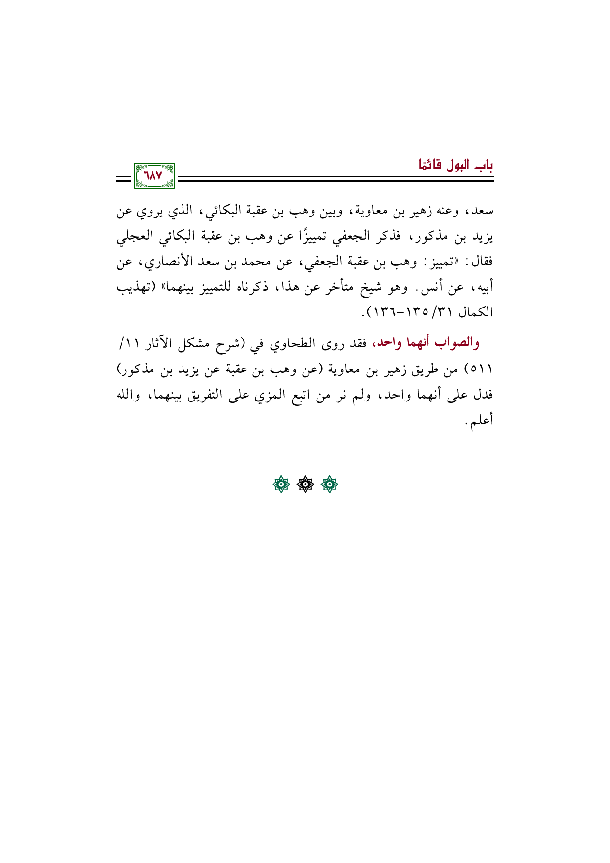 سعد، وعنه زهير بن معاوية، وبين وهب بن عقبة البكائي، الذي يروي عن يزيد بن مذكور، فذكر الجعفي تمييزًا عن وهب بن عقبة البكائي العجلي فقال: "تمييز: وهب بن عقبة الجعفي، عن محمد بن سعد الأنصاري، عن أبيه، عن أنس. وهو شيخ متأخر عن هذا، ذكرناه للتمييز بينهما" (تهذيب الكمال ٣١/ ١٣٥ - ١٣٦).