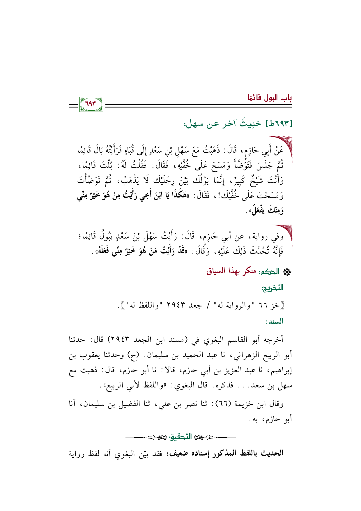 أخرجه أبو القاسم البغوي في (مسند ابن الجعد ٢٩٤٣) قال: حدثنا أبو الربيع الزهراني، نا عبد الحميد بن سليمان. (ح) وحدثنا يعقوب بن إبراهيم، نا عبد العزيز بن أبي حازم، قالا: نا أبو حازم، قال: ذهبت مع سهل بن سعد ... فذكره. قال البغوي: "واللفظ لأبي الربيع".