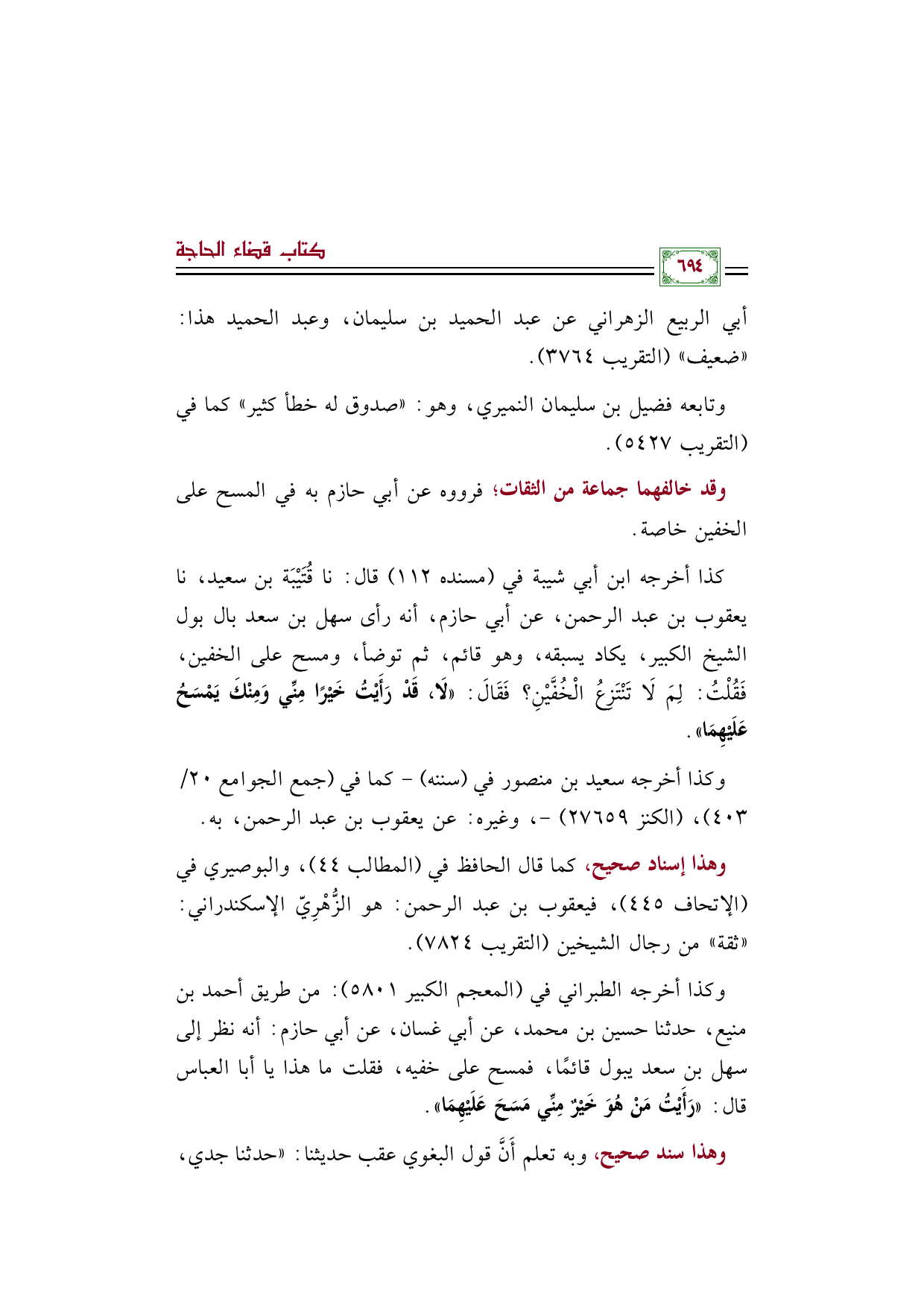 كذا أخرجه ابن أبي شيبة في (مسنده ١١٢) قال: نا قُتَيْبَة بن سعيد، نا يعقوب بن عبد الرحمن، عن أبي حازم، أنه رأى سهل بن سعد بال بول الشيخ الكبير، يكاد يسبقه، وهو قائم، ثم توضأ، ومسح على الخفين، فَقُلْتُ: لِمَ لَا تَنْتَزِعُ الْخُفَّيْنِ؟ فَقَالَ: «لَا، قَدْ رَأَيْتُ خَيْرًا مِنِّي وَمِنْكَ يَمْسَحُ عَلَيْهِمَا».