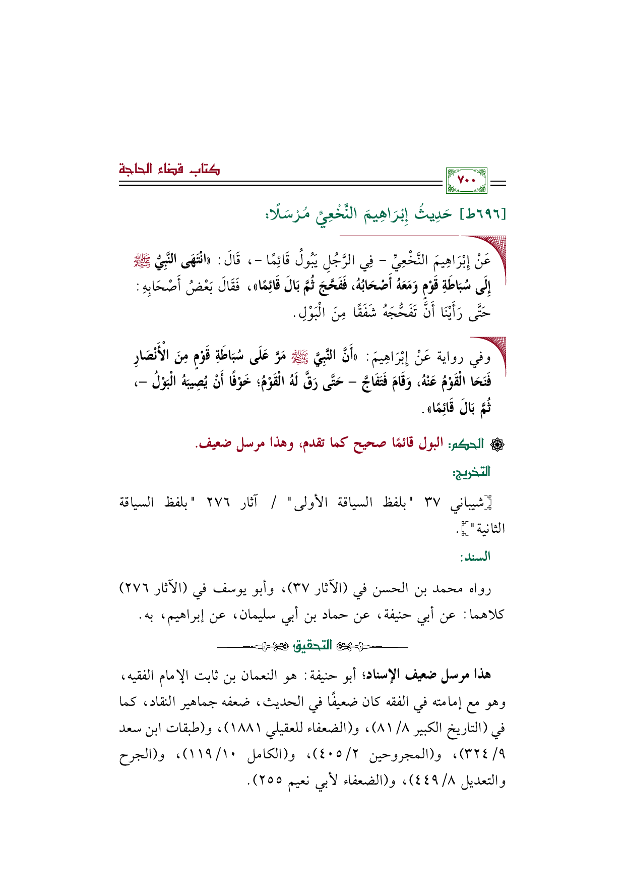 هذا مرسل ضعيف الإسناد؛ أبو حنيفة: هو النعمان بن ثابت الإمام الفقيه، وهو مع إمامته في الفقه كان ضعيفًا في الحديث، ضعفه جماهير النقاد، كما في (التاريخ الكبير ٨/ ٨١)، و (الضعفاء للعقيلي ١٨٨١)، و (طبقات ابن سعد ٩/ ٣٢٤)، و (المجروحين ٢/ ٤٠٥)، و (الكامل ١٠/ ١١٩)، و (الجرح والتعديل ٨/ ٤٤٩)، و (الضعفاء لأبي نعيم ٢٥٥).