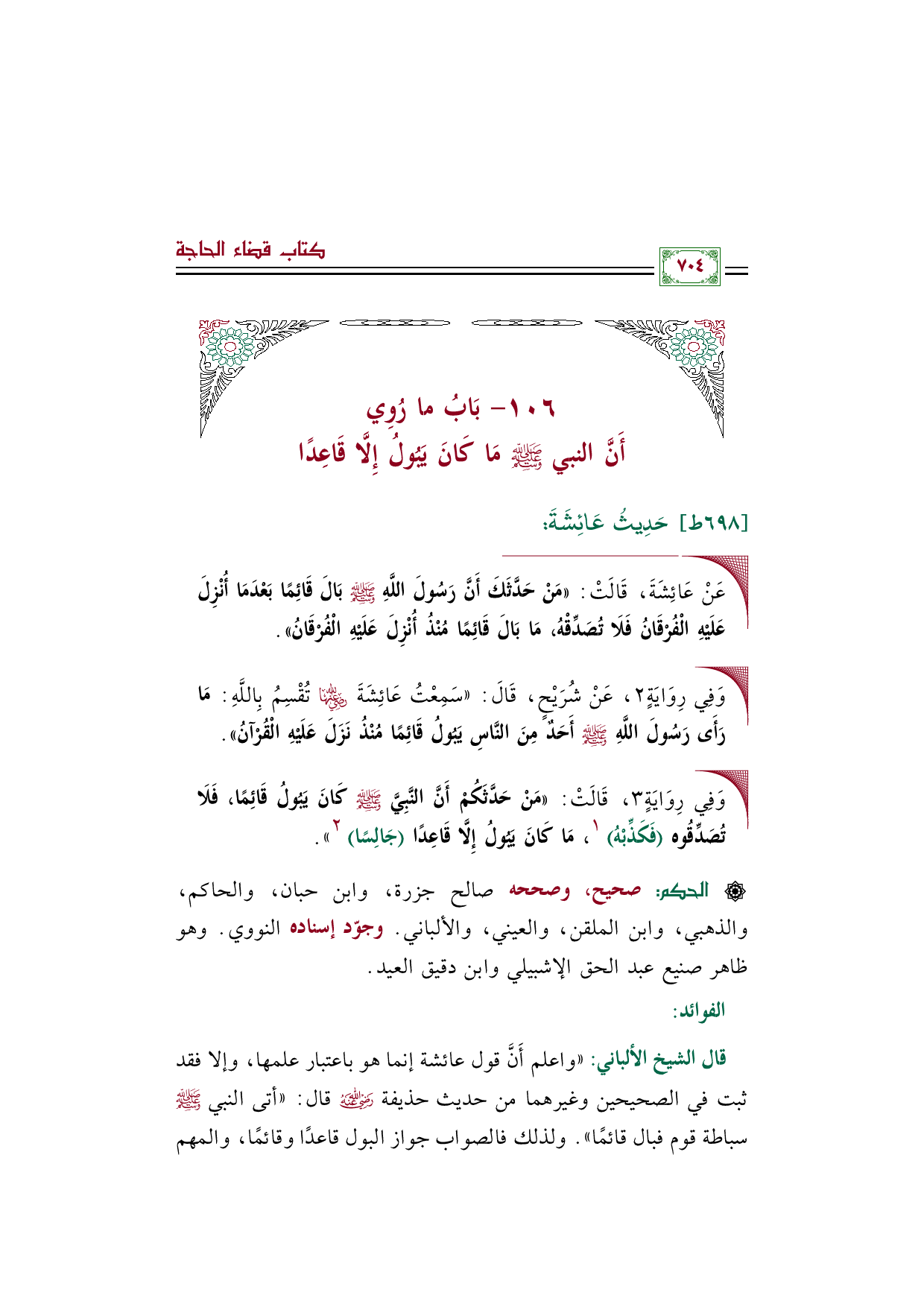 قال الشيخ الألباني: "واعلم أَنَّ قول عائشة إنما هو باعتبار علمها، وإلا فقد ثبت في الصحيحين وغيرهما من حديث حذيفة رضي الله عنه قال: «أتى النبي صلى الله عليه وسلم سباطة قوم فبال قائمًا». ولذلك فالصواب جواز البول قاعدًا وقائمًا، والمهم