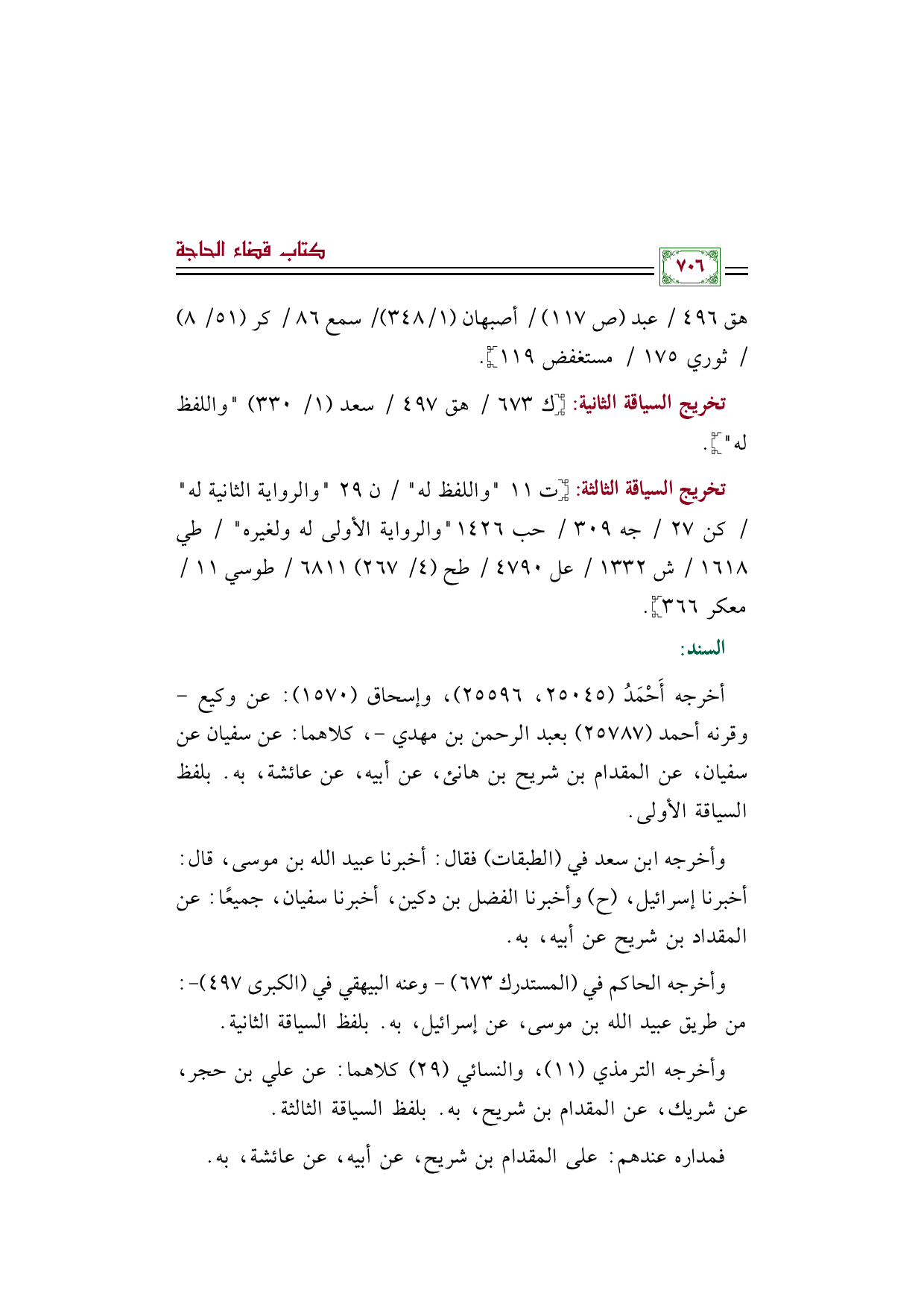 وأخرجه الترمذي (١١)، والنسائي (٢٩) كلاهما: عن علي بن حجر، عن شريك، عن المقدام بن شريح، به. بلفظ السياقة الثالثة.