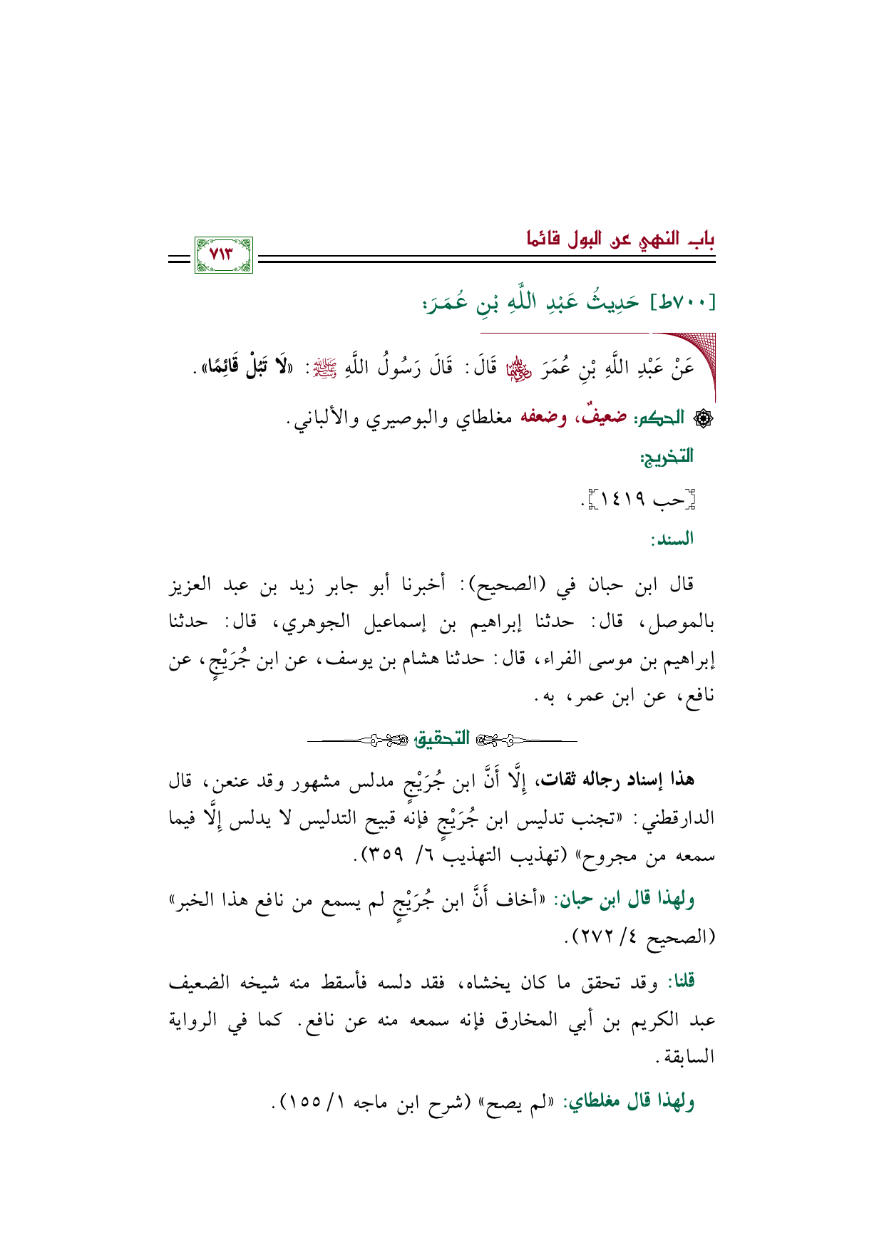 ولهذا قال ابن حبان: "أخاف أَنَّ ابن جُرَيْجٍ لم يسمع من نافع هذا الخبر" (الصحيح ٤/ ٢٧٢).