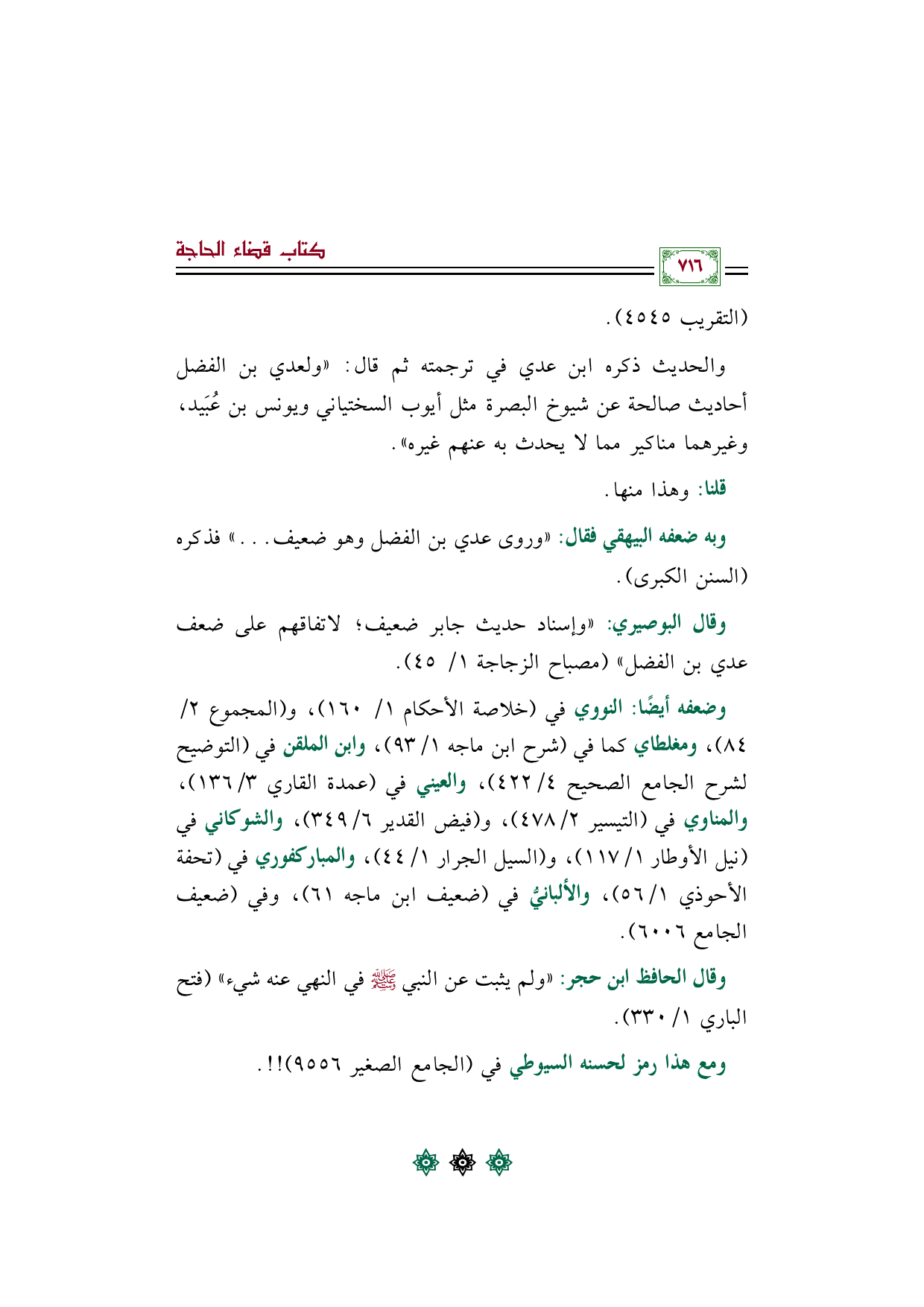 وقال البوصيري: "وإسناد حديث جابر ضعيف؛ لاتفاقهم على ضعف عدي بن الفضل" (مصباح الزجاجة ١/ ٤٥).