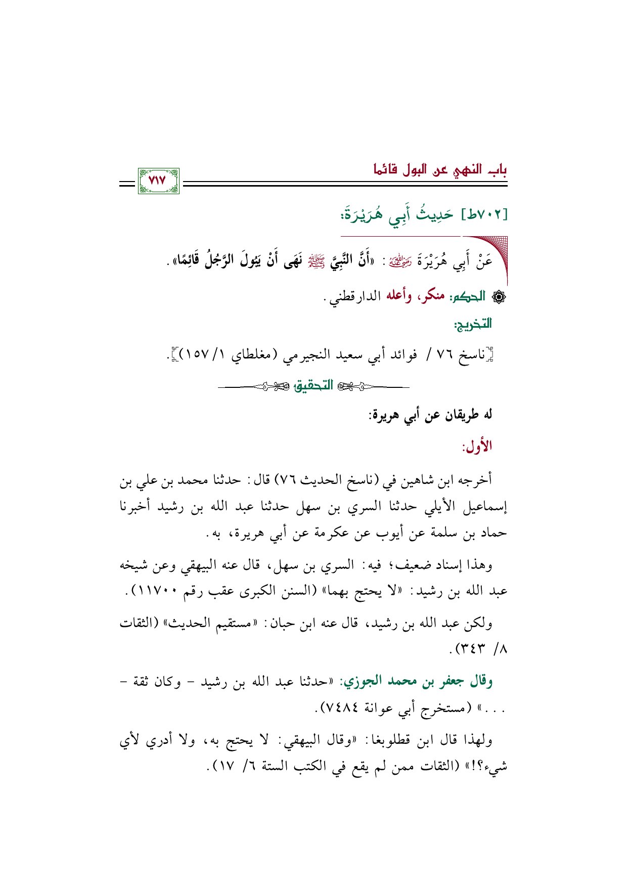 أخرجه ابن شاهين في (ناسخ الحديث ٧٦) قال: حدثنا محمد بن علي بن إسماعيل الأيلي حدثنا السري بن سهل حدثنا عبد الله بن رشيد أخبرنا حماد بن سلمة عن أيوب عن عكرمة عن أبي هريرة، به.