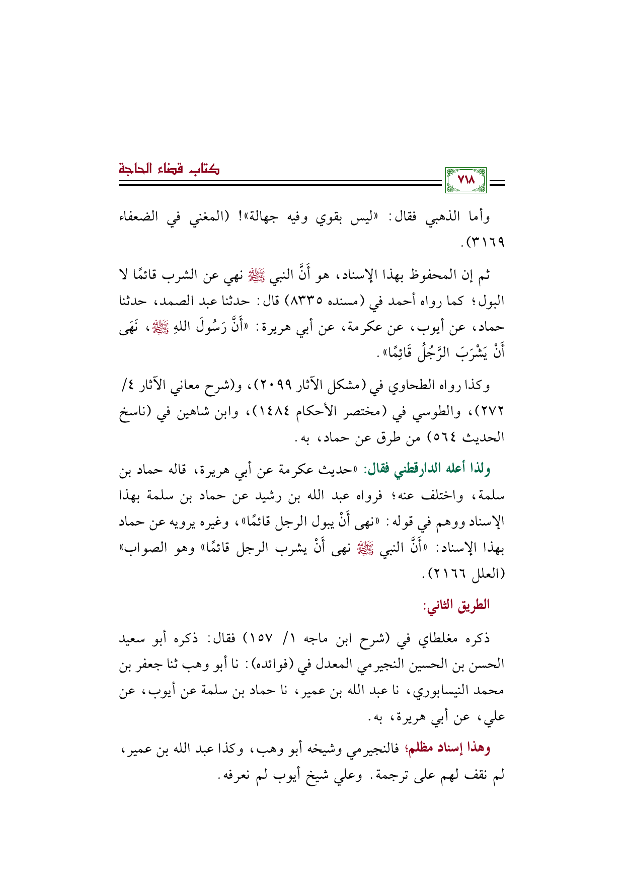 ثم إن المحفوظ بهذا الإسناد، هو أَنَّ النبي صلى الله عليه وسلم نهي عن الشرب قائمًا لا البول؛ كما رواه أحمد في (مسنده ٨٣٣٥) قال: حدثنا عبد الصمد، حدثنا حماد، عن أيوب، عن عكرمة، عن أبي هريرة: «أَنَّ رَسُولَ اللهِ صَلَّى اللهُ عَلَيْهِ وَسَلَّمَ، نَهَى أَنْ يَشْرَبَ الرَّجُلُ قَائِمًا».