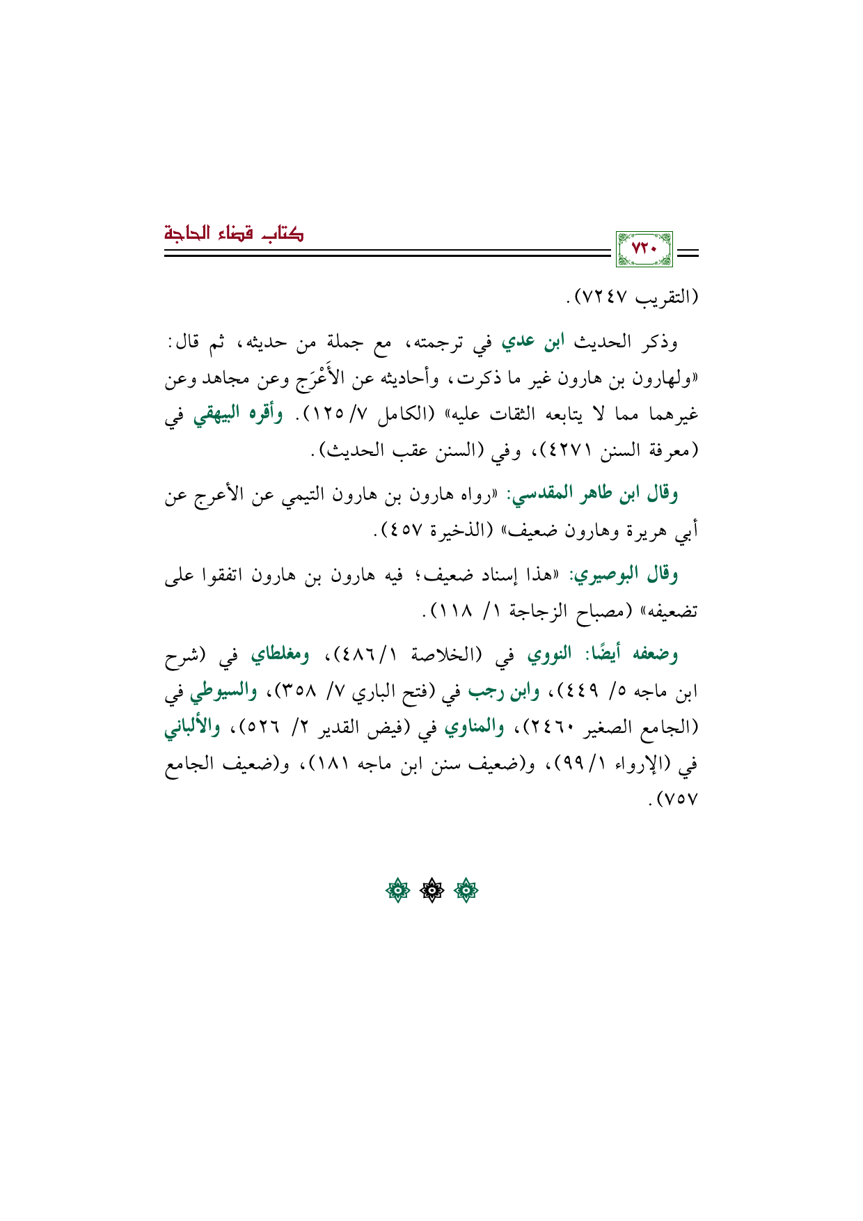 وقال ابن طاهر المقدسي: "رواه هارون بن هارون التيمي عن الأعرج عن أبي هريرة وهارون ضعيف" (الذخيرة ٤٥٧).