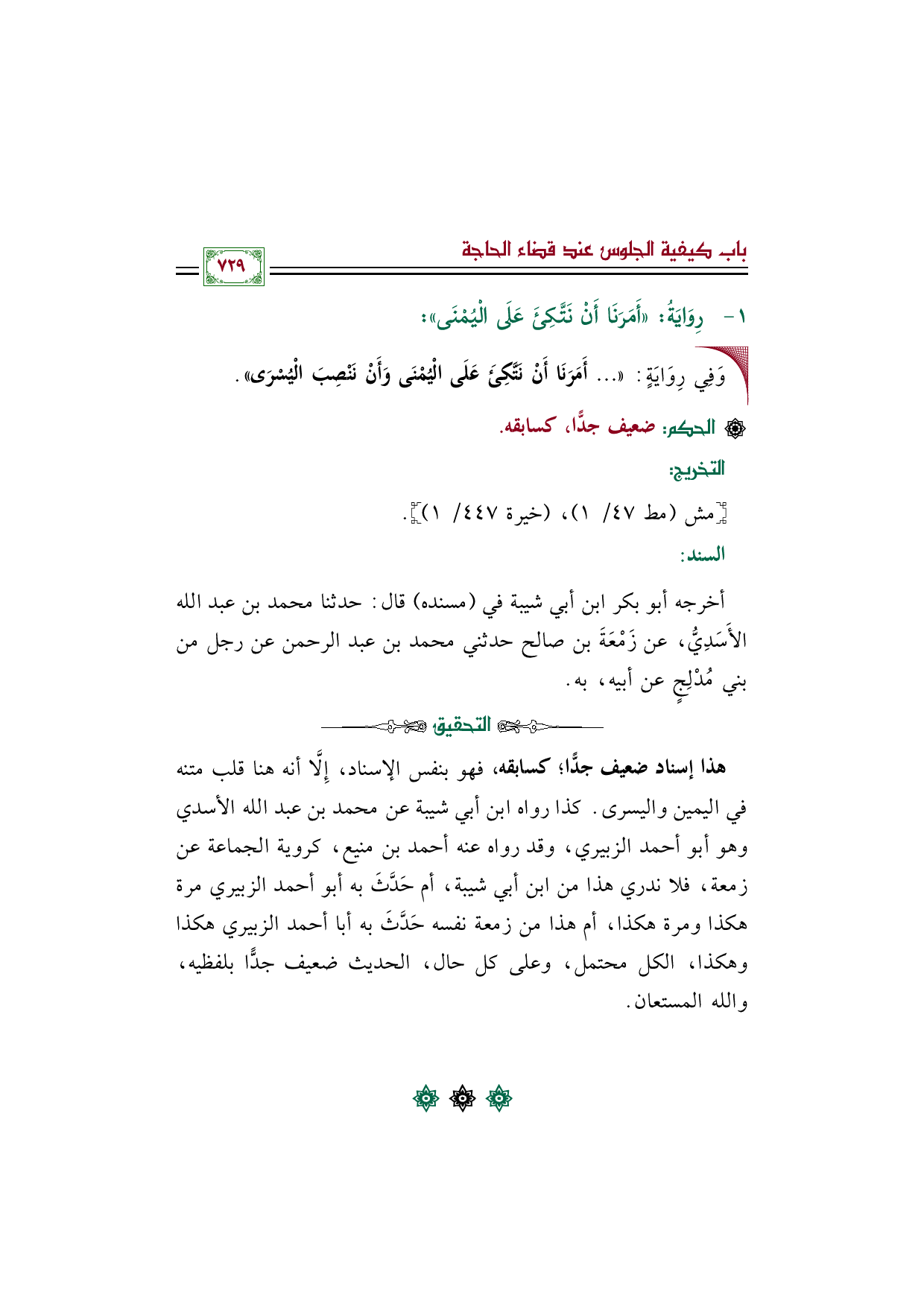 هذا إسناد ضعيف جدًّا؛ كسابقه، فهو بنفس الإسناد، إِلَّا أنه هنا قلب متنه في اليمين واليسرى. كذا رواه ابن أبي شيبة عن محمد بن عبد الله الأسدي وهو أبو أحمد الزبيري، وقد رواه عنه أحمد بن منيع، كروية الجماعة عن زمعة، فلا ندري هذا من ابن أبي شيبة، أم حَدَّثَ به أبو أحمد الزبيري مرة هكذا ومرة هكذا، أم هذا من زمعة نفسه حَدَّثَ به أبا أحمد الزبيري هكذا وهكذا، الكل محتمل، وعلى كل حال، الحديث ضعيف جدًّا بلفظيه، والله المستعان.