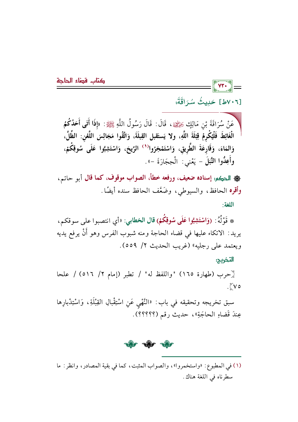 سبق تخريجه وتحقيقه في باب: "النَّهْيِ عَنِ اسْتِقْبالِ القِبْلَةِ، وَاسْتِدْبارِها عِندَ قَضاءِ الحاجَةِ"، حديث رقم (؟ ؟ ؟ ؟ ؟ ).
