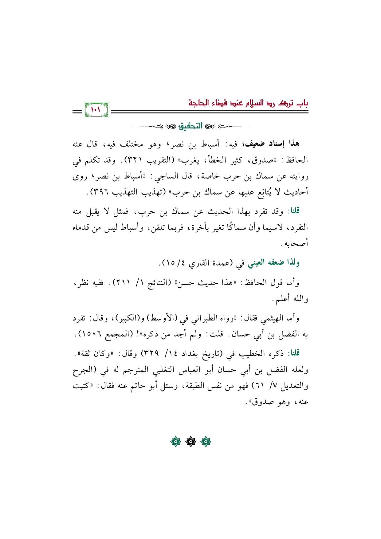 قلنا: وقد تفرد بهذا الحديث عن سماك بن حرب، فمثل لا يقبل منه التفرد، لاسيما وأن سماكًا تغير بأخرة، فربما تلقن، وأسباط ليس من قدماء أصحابه.