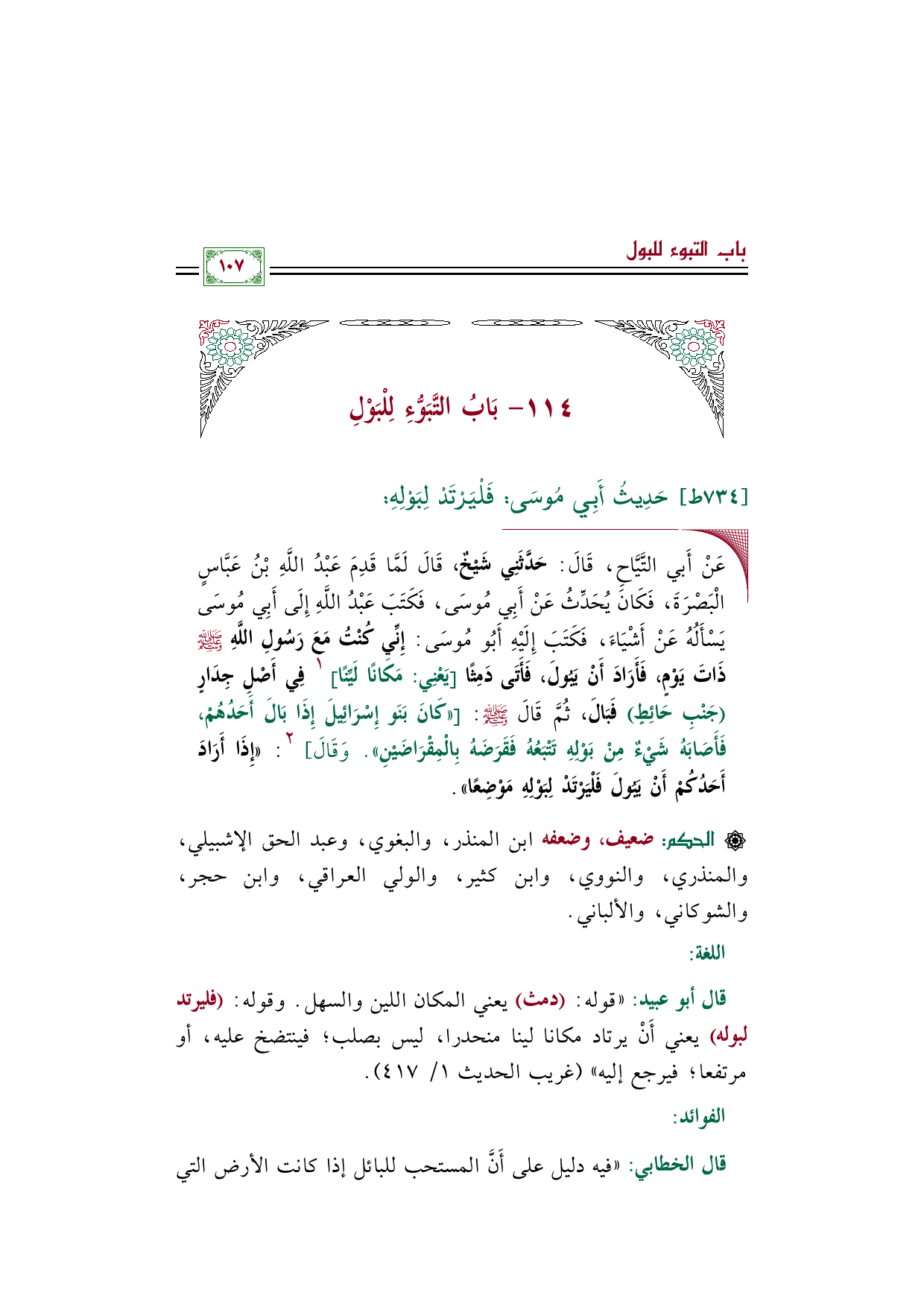 قال الخطابي: "فيه دليل على أَنَّ المستحب للبائل إذا كانت الأرض التي