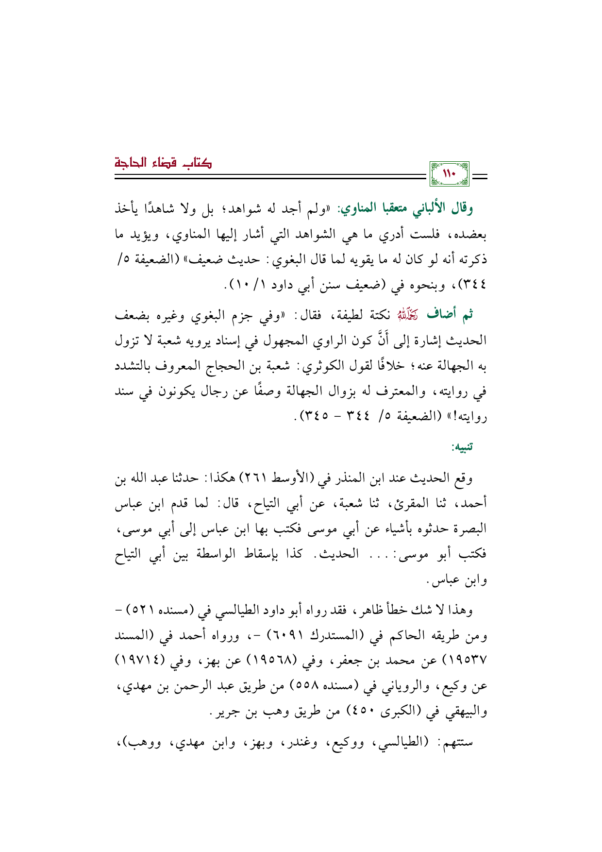 وقال الألباني متعقبا المناوي: "ولم أجد له شواهد؛ بل ولا شاهدًا يأخذ بعضده، فلست أدري ما هي الشواهد التي أشار إليها المناوي، ويؤيد ما ذكرته أنه لو كان له ما يقويه لما قال البغوي: حديث ضعيف" (الضعيفة ٥/ ٣٤٤)، وبنحوه في (ضعيف سنن أبي داود ١/ ١٠).