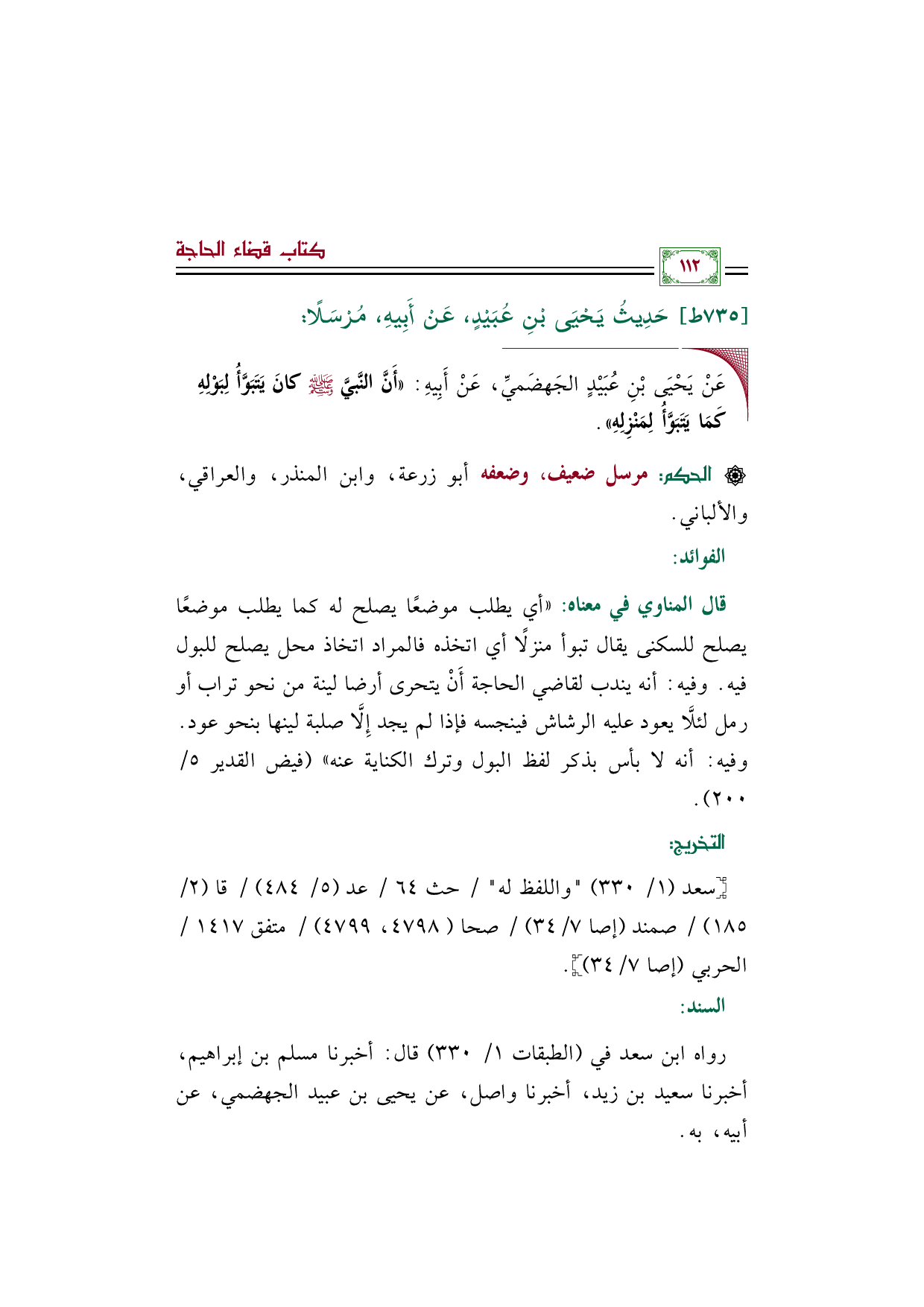 [الحكم]: مرسل ضعيف، وضعفه أبو زرعة، وابن المنذر، والعراقي، والألباني.