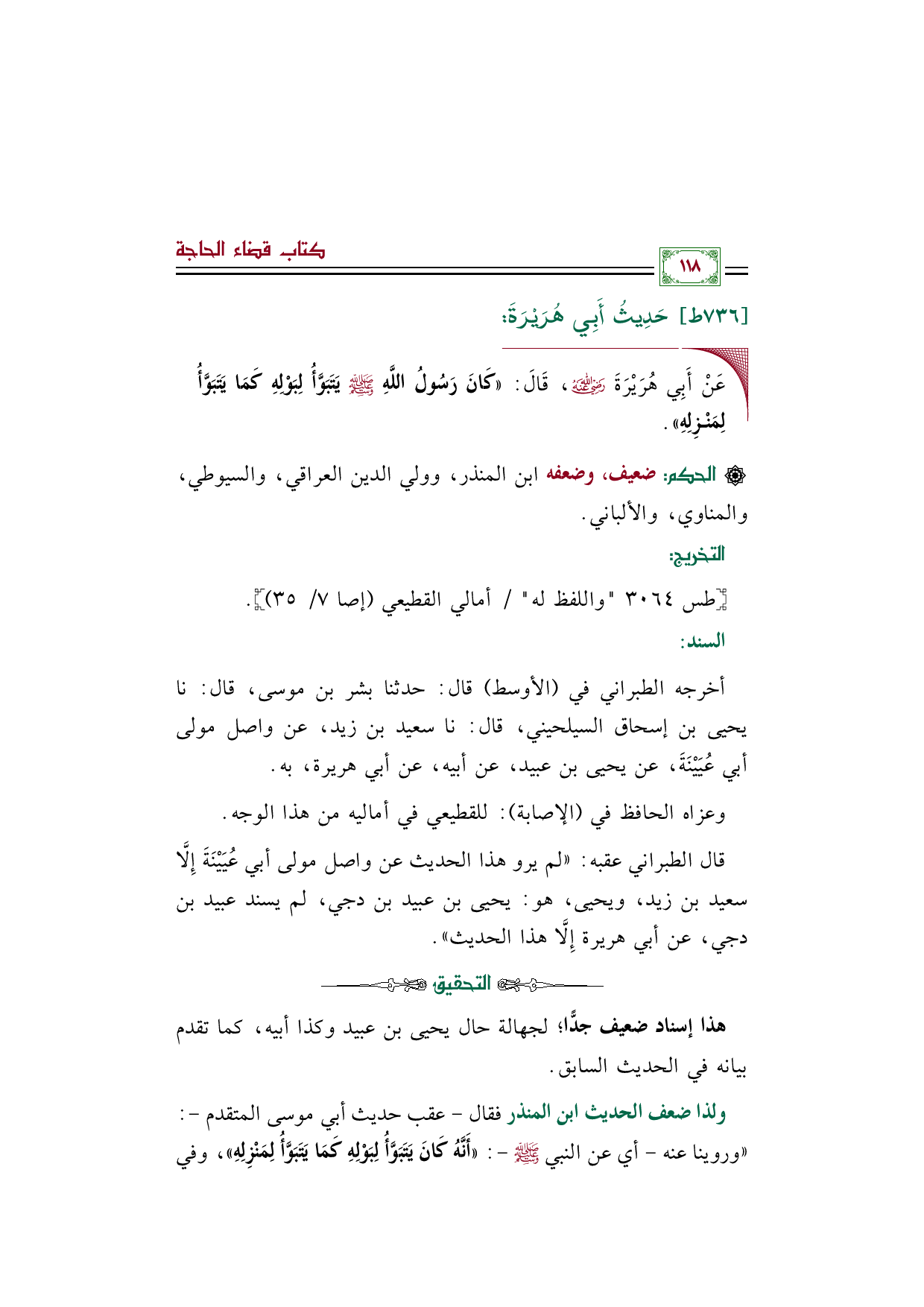 ◼ عَنْ أَبِي هُرَيْرَةَ رضي الله عنه، قَالَ: «كَانَ رَسُولُ اللَّهِ صلى الله عليه وسلم يَتَبَوَّأُ لِبَوْلِهِ كَمَا يَتَبَوَّأُ لِمَنْزِلِهِ».