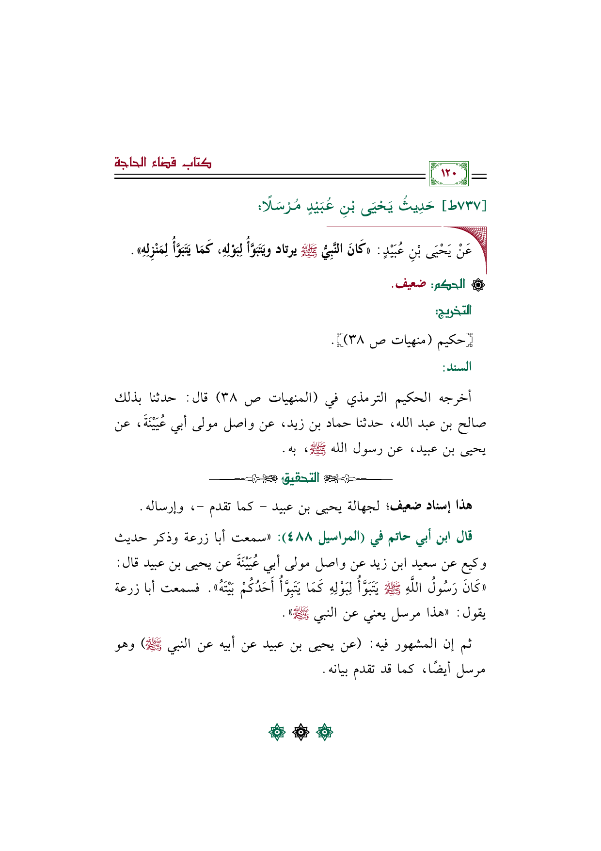 قال ابن أبي حاتم في (المراسيل ٤٨٨): "سمعت أبا زرعة وذكر حديث وكيع عن سعيد ابن زيد عن واصل مولى أبي عُيَيْنَةَ عن يحيى بن عبيد قال: ((كَانَ رَسُولُ اللَّهِ صَلَّى اللَّهُ عَلَيْهِ وَسَلَّمَ يَتَبَوَّأُ لِبَوْلِهِ كَمَا يَتَبِوَّأُ أَحَدُكُمْ بَيْتَهُ)). فسمعت أبا زرعة يقول: "هذا مرسل يعني عن النبي صلى الله عليه وسلم".