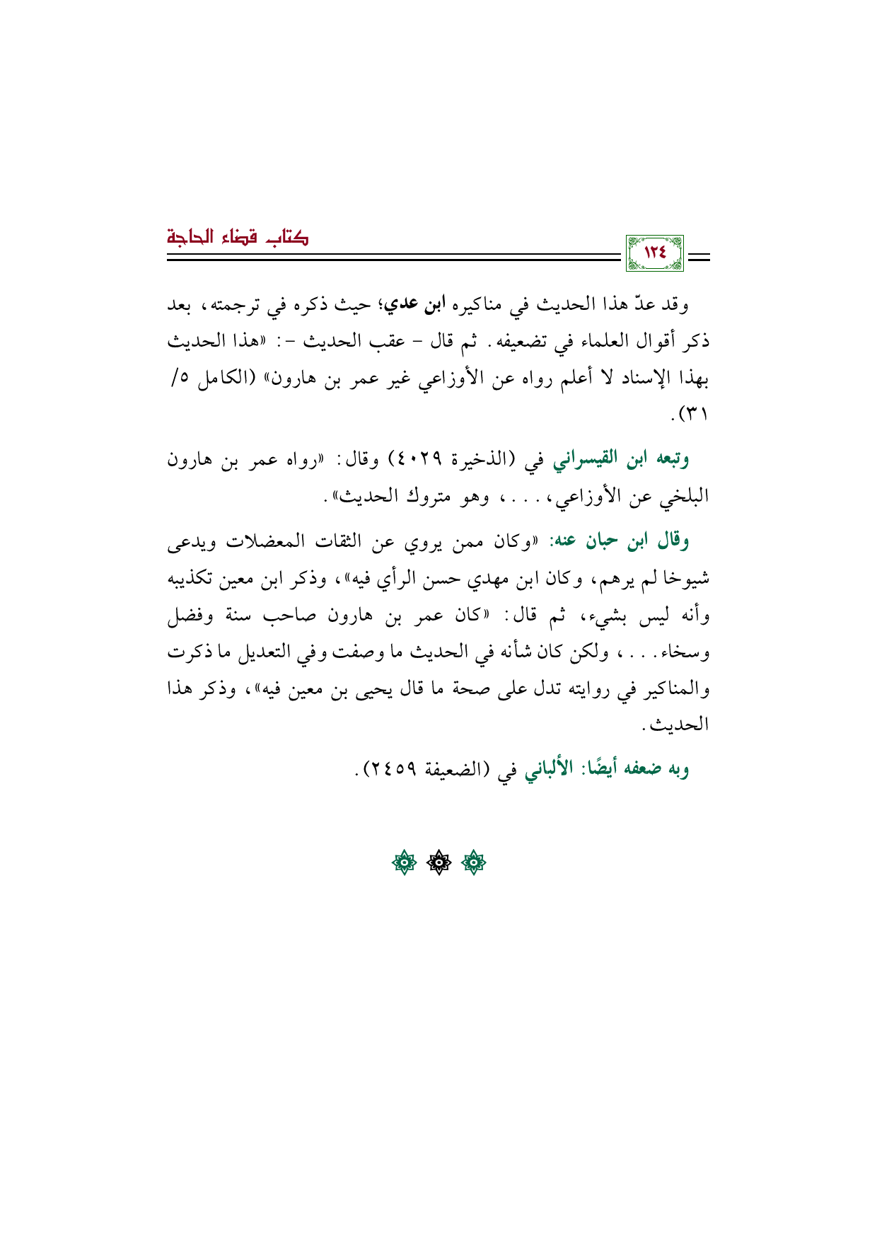 وقال ابن حبان عنه: "وكان ممن يروي عن الثقات المعضلات ويدعى شيوخا لم يرهم، وكان ابن مهدي حسن الرأي فيه"، وذكر ابن معين تكذيبه وأنه ليس بشيء، ثم قال: "كان عمر بن هارون صاحب سنة وفضل وسخاء ... ، ولكن كان شأنه في الحديث ما وصفت وفي التعديل ما ذكرت والمناكير في روايته تدل على صحة ما قال يحيى بن معين فيه"، وذكر هذا الحديث.