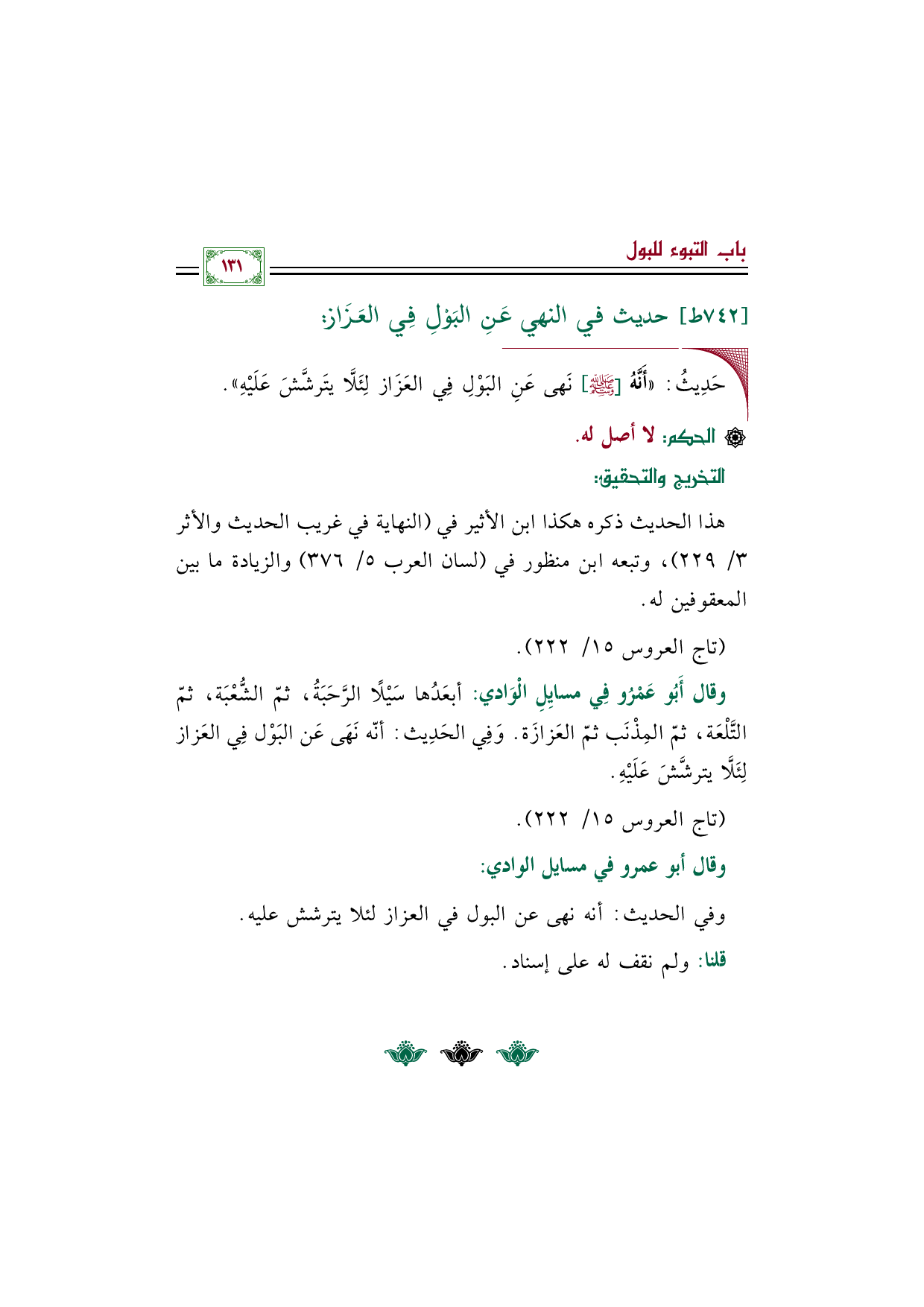 ٧٤٢ - حديث في النهي عَنِ البَوْلِ فِي العَزَاز: