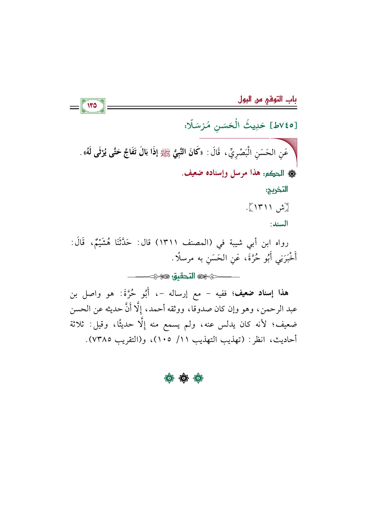 هذا إسناد ضعيف؛ ففيه - مع إرساله -، أَبُو حُرَّةَ: هو واصل بن عبد الرحمن، وهو وإن كان صدوقا، ووثقه أحمد، إِلَّا أَنَّ حديثه عن الحسن ضعيف؛ لأنه كان يدلس عنه، ولم يسمع منه إِلَّا حديثًا، وقيل: ثلاثة أحاديث، انظر: (تهذيب التهذيب ١١/ ١٠٥)، و (التقريب ٧٣٨٥).