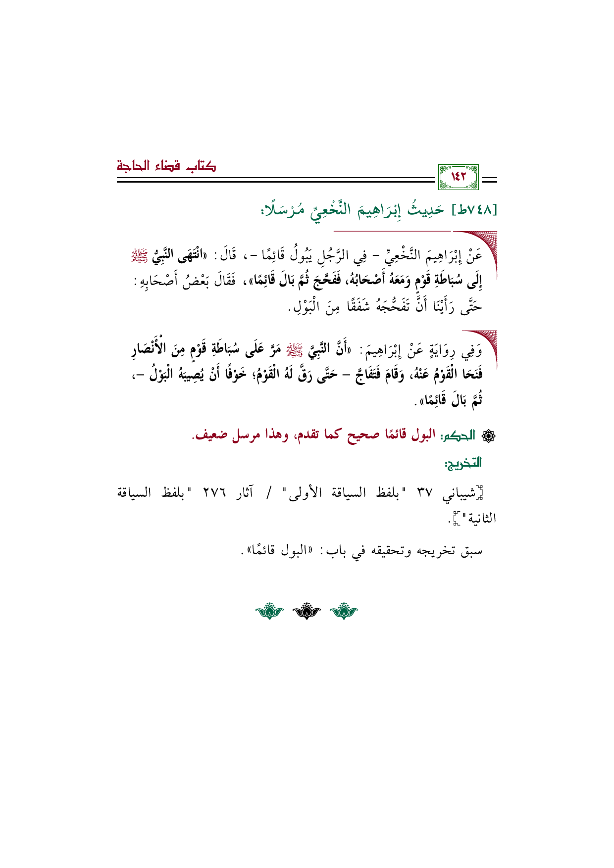 ◼ عَنْ إِبْرَاهِيمَ النَّخْعِيِّ - فِي الرَّجُلِ يَبُولُ قَائِمًا -، قَالَ: «انْتَهَى النَّبِيُّ صَلَّى اللهُ عَلَيْهِ وَسَلَّمَ إِلَى سُبَاطَةِ قَوْمٍ وَمَعَهُ أَصْحَابُهُ، فَفَحَّجَ ثُمَّ بَالَ قَائِمًا»، فَقَالَ بَعْضُ أَصْحَابِهِ: حَتَّى رَأَيْنَا أَنَّ تَفَحُّجَهُ شَفَقًا مِنَ الْبَوْلِ.