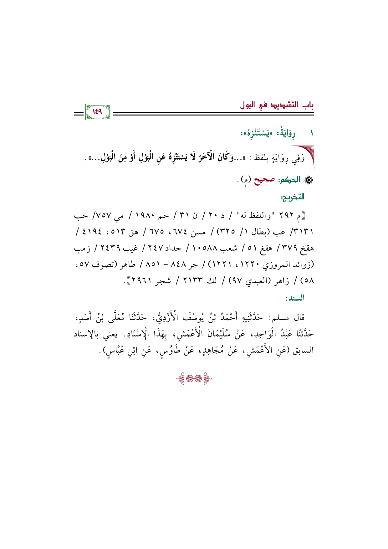 • وَفِي رِوَايَةٍ بلفظ: « .... وَكَانَ الْآخَرُ لَا يَسْتَنْزِهُ عَنِ الْبَوْلِ أَوْ مِنَ الْبَوْلِ ... ».